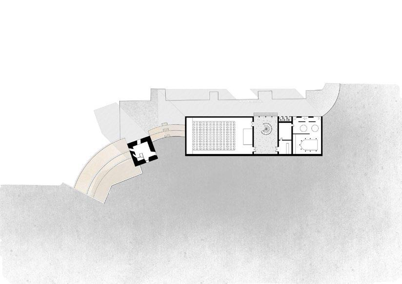 Ici sont représentées les fonctions publiques, avec le studio de danse au rez-de-chaussée et la brasserie au dernier étage. Comme le montre le schéma, la brasserie n’est accessible que par un ascenseur situé sur le côté nord du bâtiment. Cet ascenseur est placé en retrait afin de diviser le bâtiment en deux et de souligner son rôle dans le bâtiment. L’autre schéma montre l’accessibilité des deux salles de danse. L’entrée principale se trouve à l’opposé de celle du résident, qui est en jaune ci-dessous. De cette manière, un couloir traversant toute la largeur du bâtiment est rempli de lumière. Un escalier en colimaçon mène à une passerelle qui permet de profiter de la vue depuis le haut de la grande salle de danse.