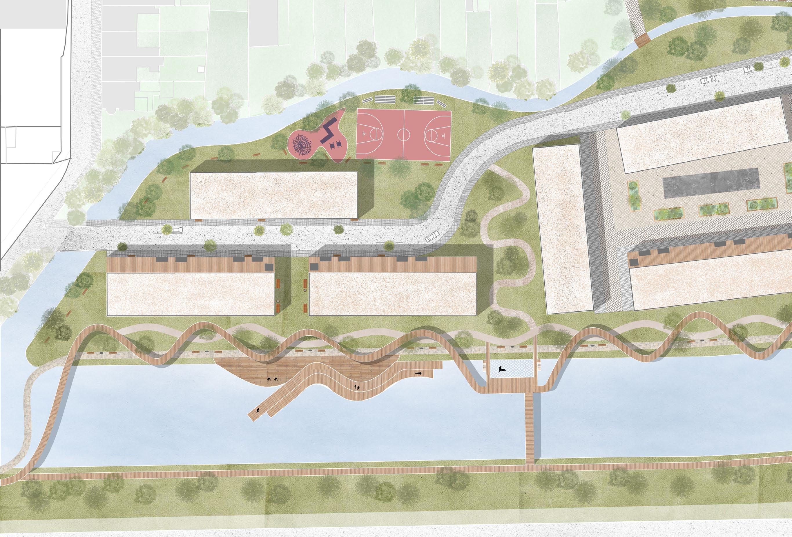 Pour souligner le fait que ce projet urbain est situé le long de la rivière, les bâtiments suivent une ligne qui crée une longue aire de repos sur l’herbe. Pour la rendre plus attrayante, une longue passerelle en bois est entrelacée avec un autre chemin sablé pour créer des voies différentes. Pour ajouter un point de repos, des plates-formes d’assise abaissées sont ajoutées à la structure en bois. La passerelle, qui s’étend sur la terre et la rivière, relie les deux rives.