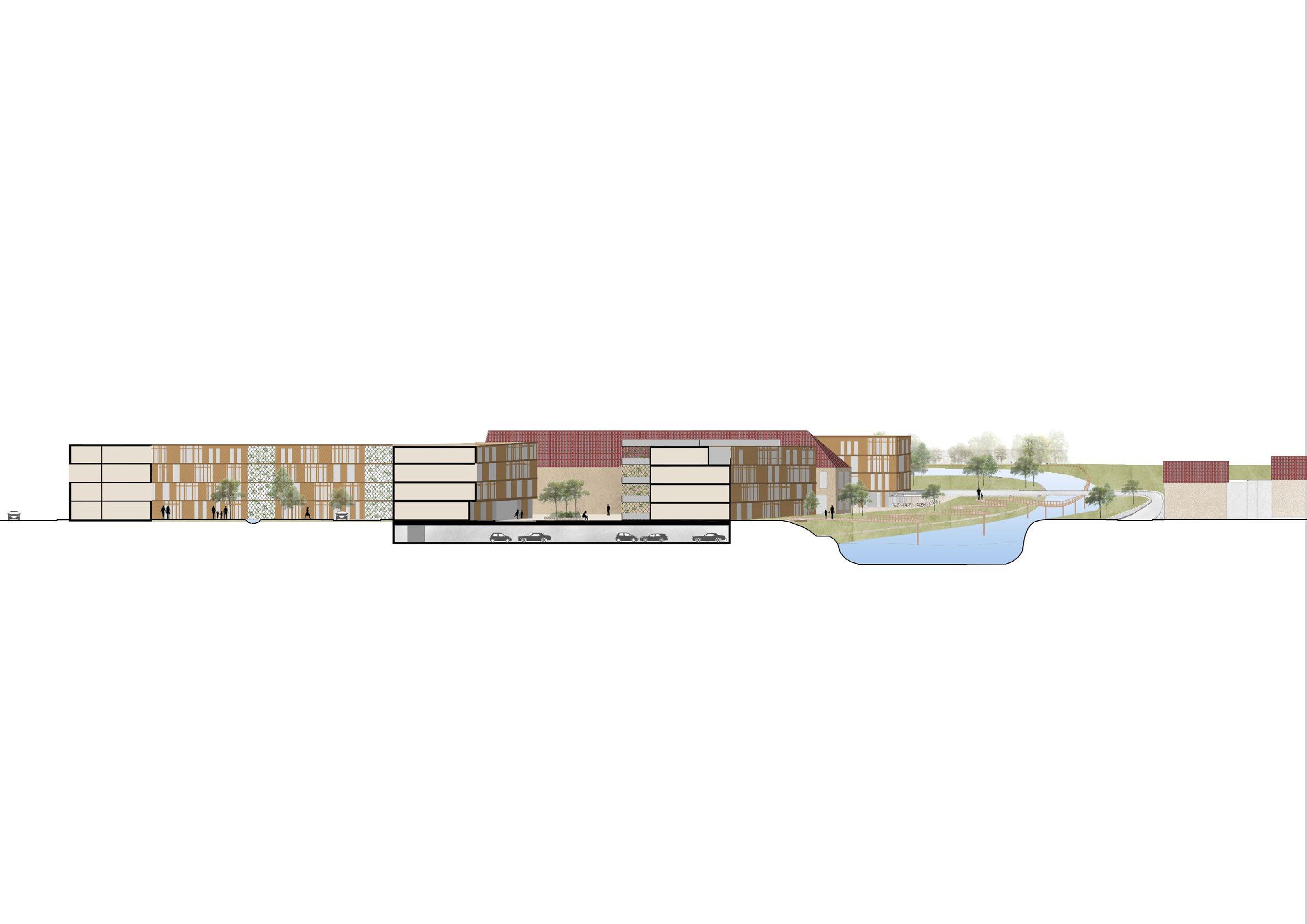 This new road links the north with the south and serves the flats by this smooth curve in the middle. The buildings follow a line that creates a long and quiet resting area for the riverside.