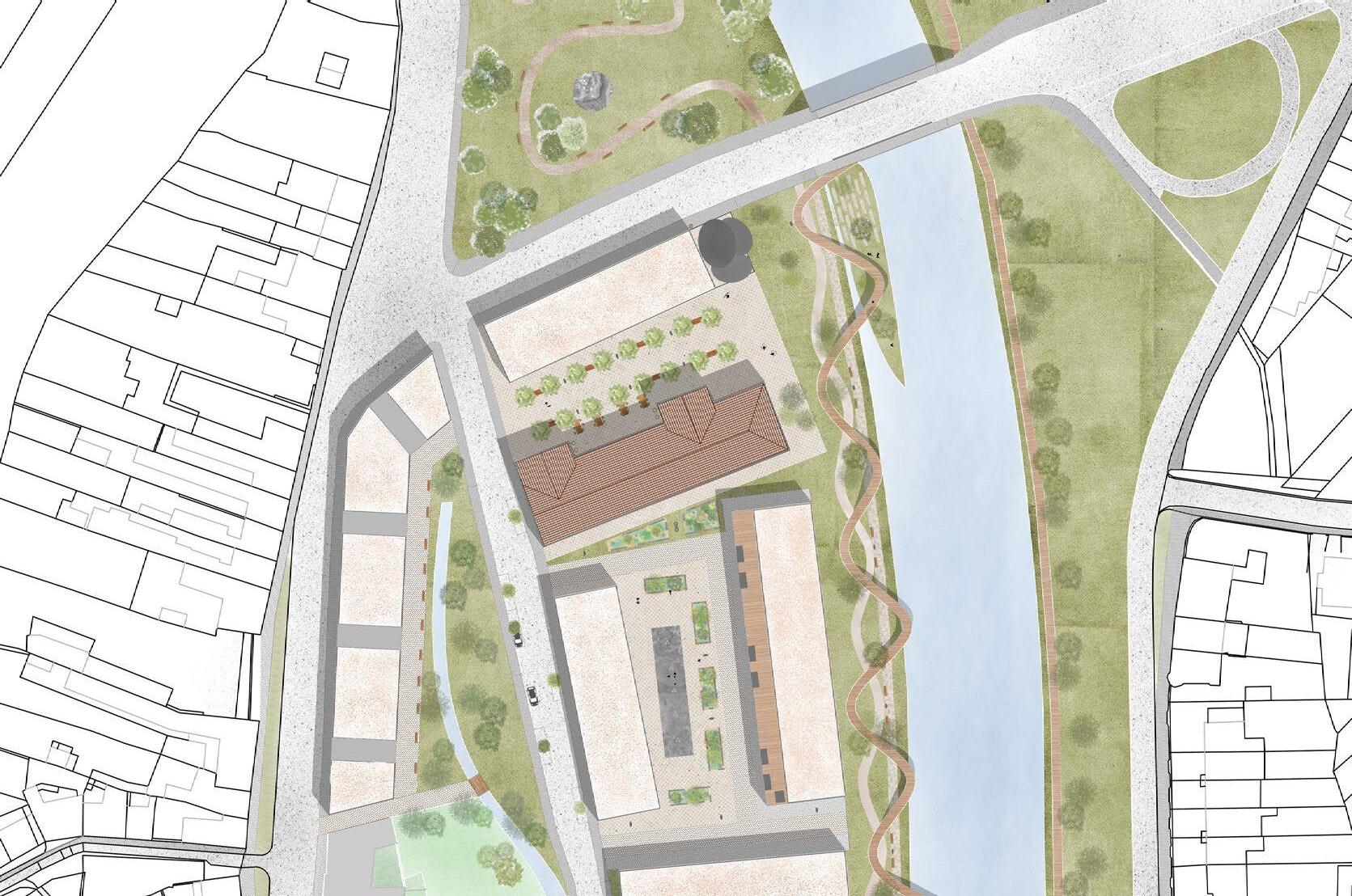 To emphasise the fact that this urban project is located alongside the river, the buildings follow a line that creates a long grassy rest area. To make it more attractive, a long wooden footbridge is interlaced with another sanded path to create different lanes. To add a resting point, lowered seating platforms are added to the wooden structure. The footbridge, which spans both land and river, links the two banks.