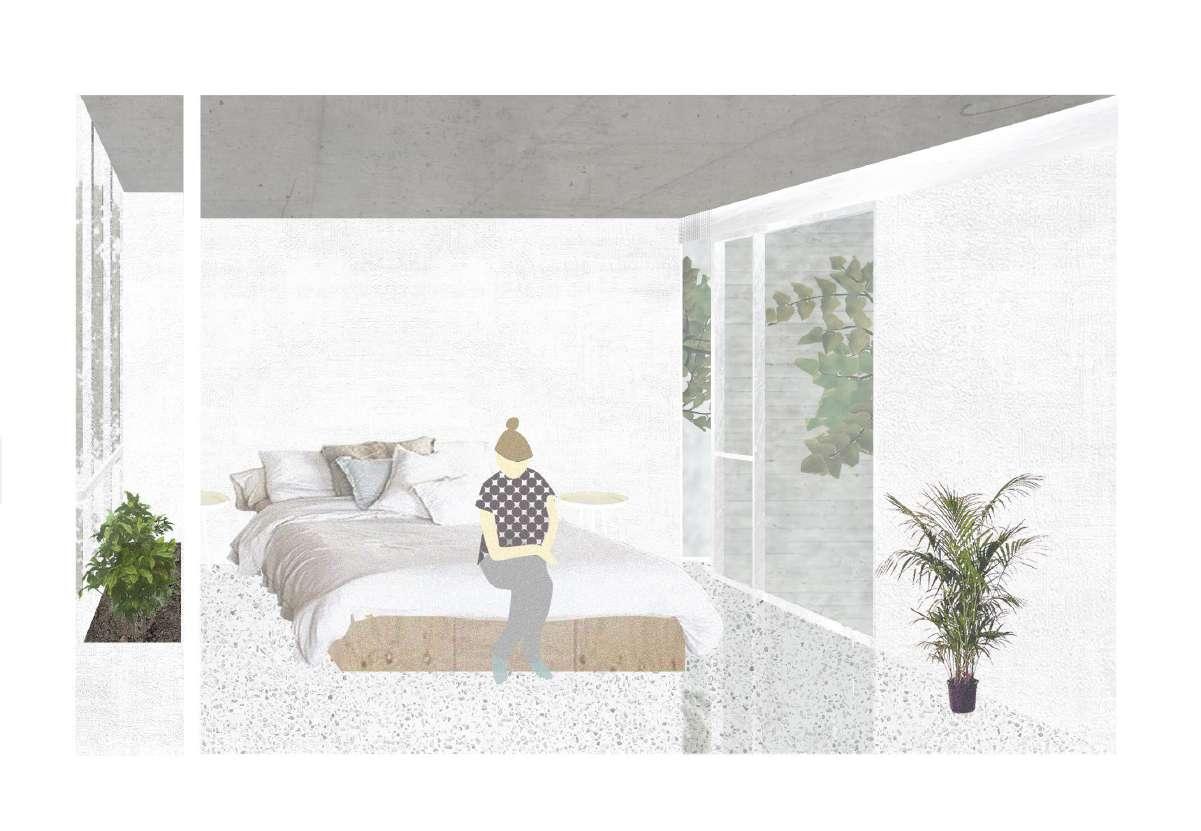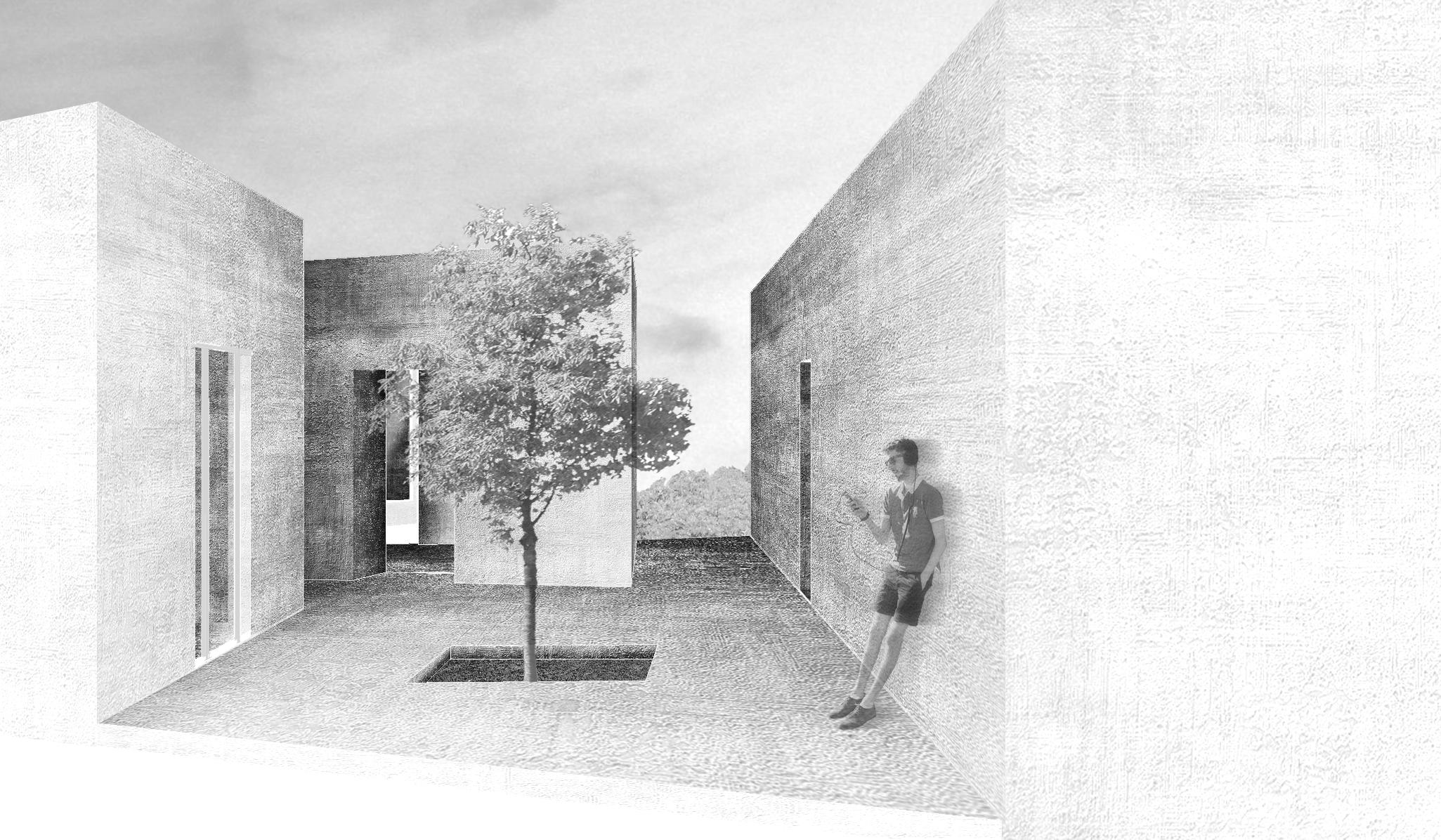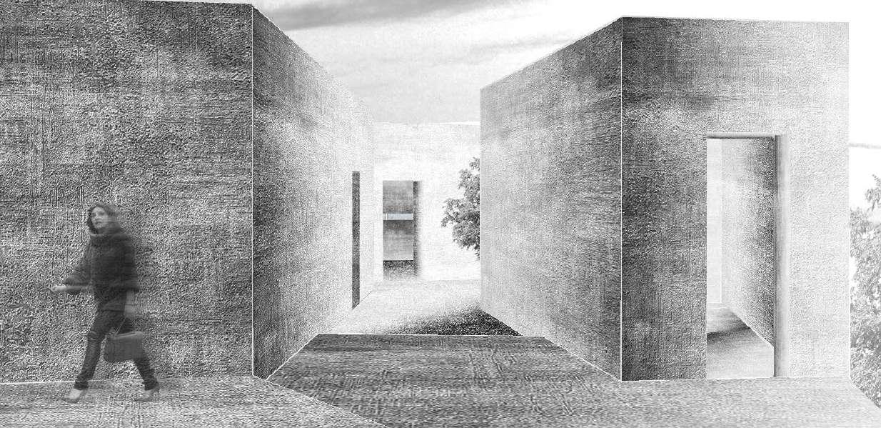 Intention spatiale: Créer une architecture pure, jouant avec le mouvement du corps à travers les volumes. Une balade propose de percevoir des différentes percées visuelles comme des cadres mettant en scène le paysage.