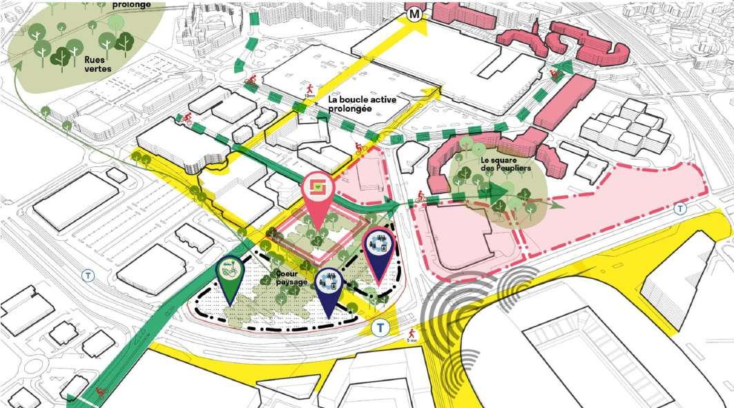 Mission: Conception d’un nouveau quartier de 3.8 hc dans le cadre d’une mutation urbaine d’une zone commerciale. Travail à l’échelle du quartier et de la parcelle. Scénarisation des futurs enjeux urbains. Etudes sur les formes urbaines, capacités et faisabilités d’un quartier de 53.000m² de SDP. Programmation mixte : Bureaux - logements - commerces - parking silo. Animation d’ateliers thématiques («Habiter» - «Les espaces publics»...) avec MOA , services publics de la ville.