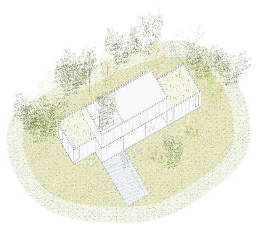 Ici, l’axonométrie montre la phase 1 du projet (sans la conserverie qui arrive dans un second temps).