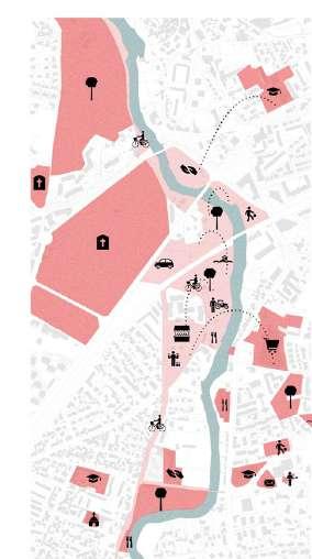 La rivière: Passant au milieu de notre site, il était nécessaire de l’intégrer davantage au quartier. Cette rivière permet une promenade avec des vues et accès sur celle-ci. Le lez, aujourd’hui invisible, devient un nouveau lien entre les quartiers acollés.