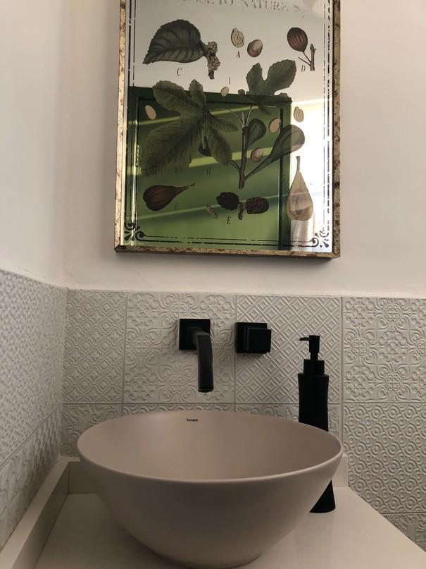 Projeto e obra de lavabo que era revestido com tecido escuro em tons de terra e azul, e clareamos para deixar umambiente mais leve e clean, manteve a pedido do cliente o armário em madeira que foi projetado pelo irmão da proprietária. Adicionamos revestimentos em porcelanatos foscos.