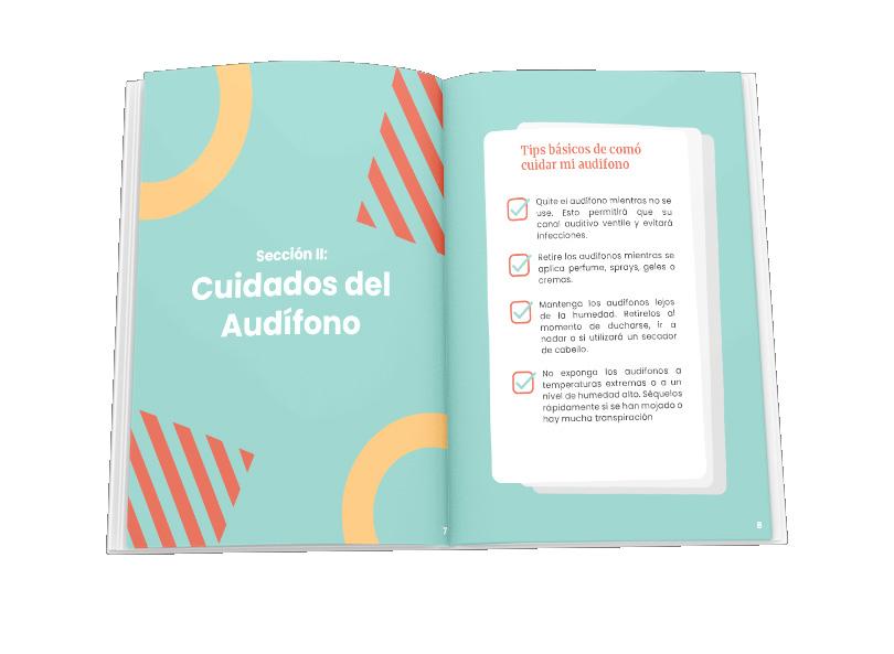 Portada de sección “Cuidados del audífono” y hoja con tips de cuidado básico, en Volumen 1.