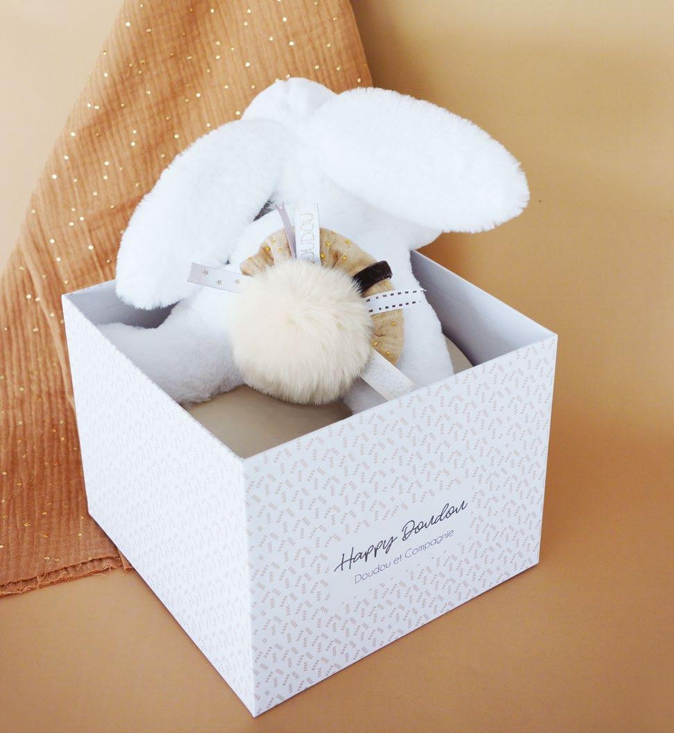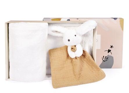 • Un coffret indispensable au quotidien de bébé : un plaid douceur rassurant et réconfortant accompagné de son petit doudou lapin avec carré lange 100% coton !