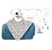 • Un coffret indispensable au quotidien de bébé : un plaid douceur rassurant et réconfortant accompagné de son petit doudou Yoca avec carré lange à motifs et 100% coton !