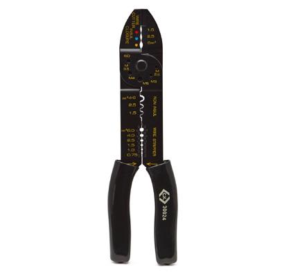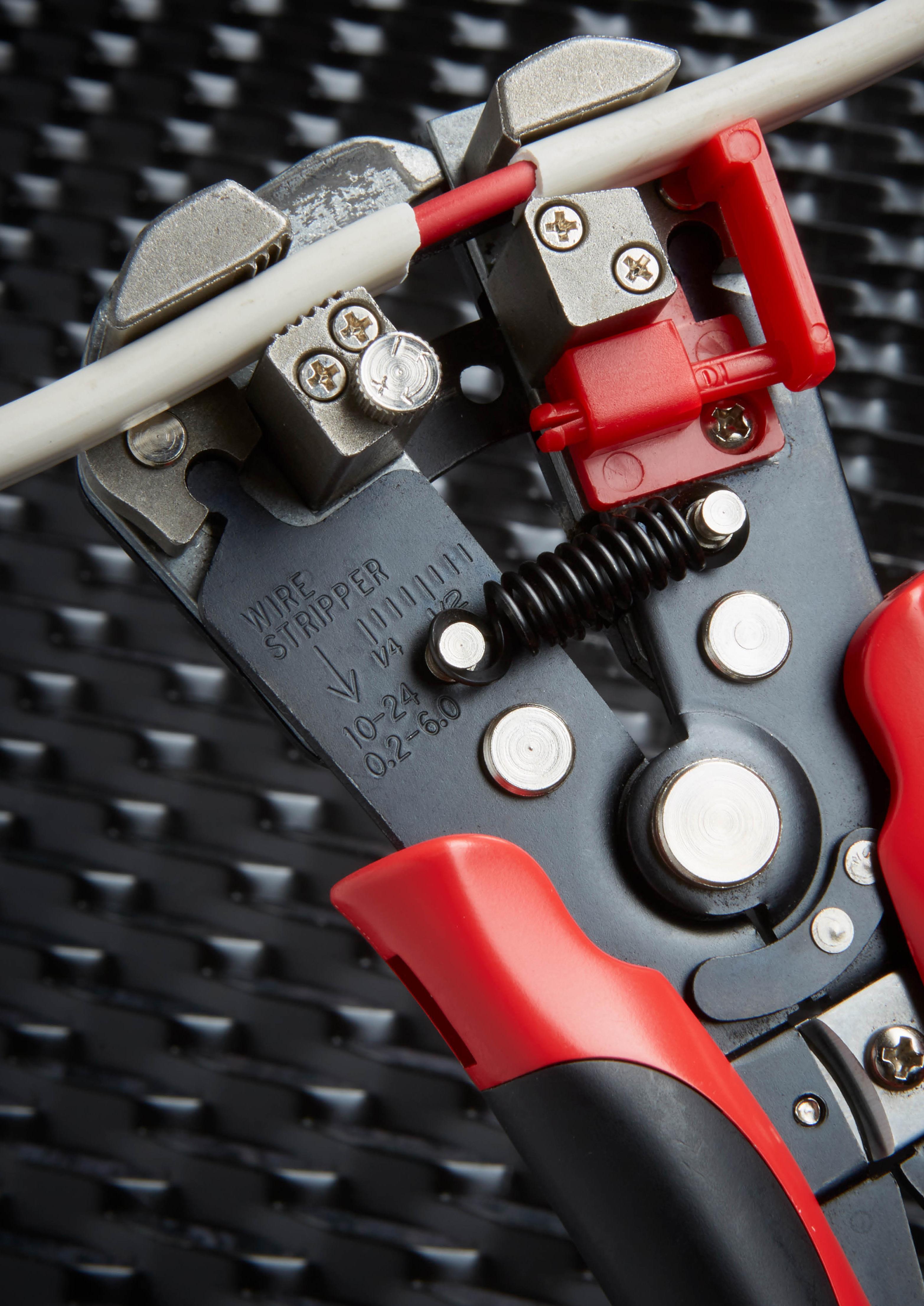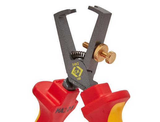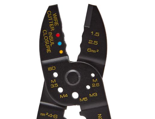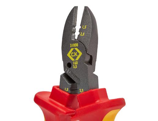Pattress screw shear for damage free cutting of 3.5mm pattress screws. Wire stripping notches for effortless & damage free stripping of 1.5 & 2.5mm² wire. Wire bending anvil for quick & damage free doubling back of copper wire.