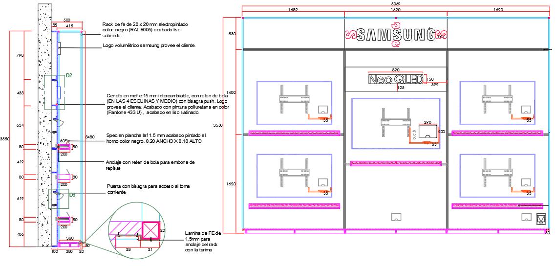 Para cumplir con los requerimientos del proyecto, se elaboraron los planos a detalle de producción de carpintería. El mueble fue construido en MDF de 15 mm, y se aplicó una capa de pintura poliuretana en los colores corporativos de la marca, garantizando una estética acorde con la identidad visual de Samsung.