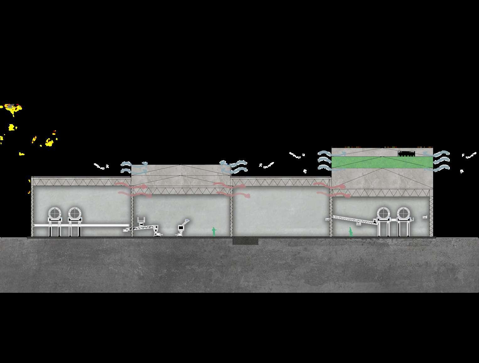La planta de reciclaje cuenta con diferentes desniveles, enterrando ligeramente el proyecto, creando diferentes visuales por parte de las personas desde la entrada, recorrido y termino del proyecto, con esto de buscó no sólo satisfacer un punto implantación volumentrica, sino también otorgar vivencias y experiencias nuevas, como lo es ir descendiendo gradualmente e integrándose al proyecto. Así mismo, se generaron espacios interiores con muros transparente adicionando más visuales.