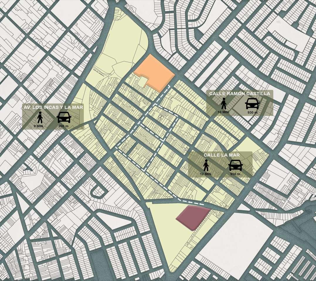 Por otra parte, el nivel urbano, el sector presenta vacíos y tierras que se generaron debido a la expansión urbana que experimentó la ciudad luego de la ruptura de la muralla que rodeaba el centro.