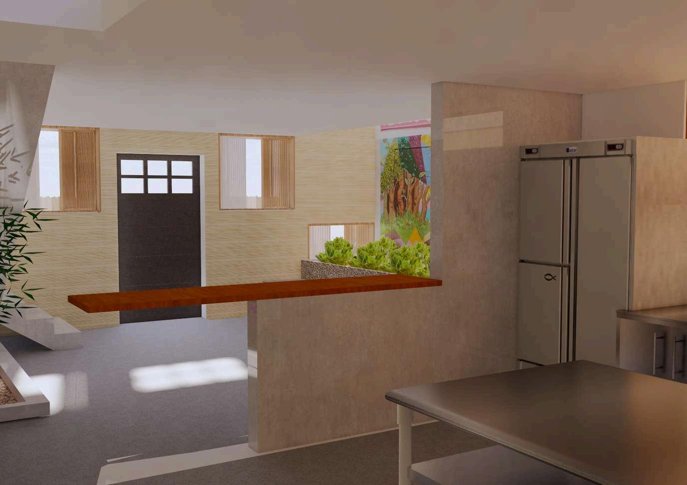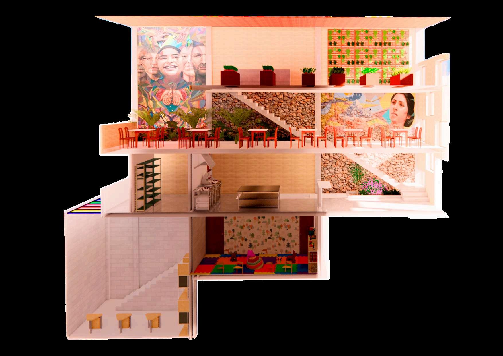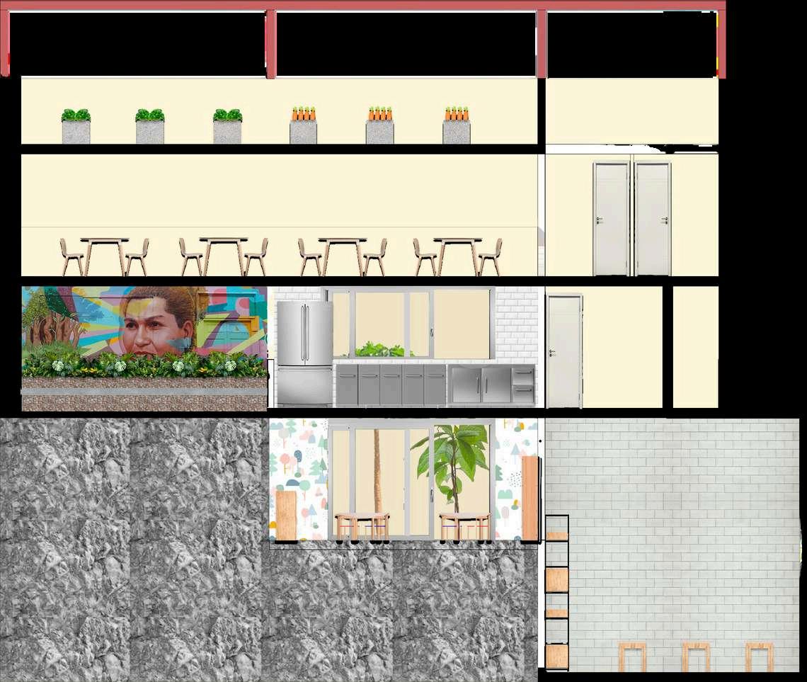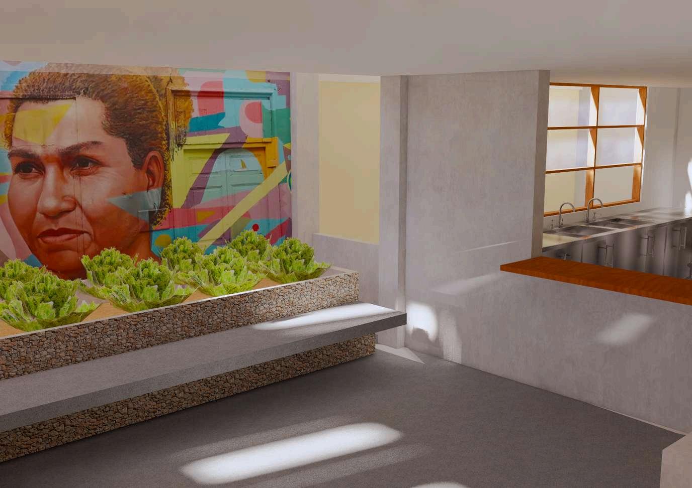 La segunda planta continúa con la lógica de los desniveles. En el primer desnivel se encuentra el comedore y en el segundo la cocina, que es el corazón del proyecto, donde se preparan los alimentos que se distribuirán a los beneficiarios.La tercera planta, están ubicados el biohuerto, comedor y almacén en su respectivo desnivel. Finalmente en la cuarta planta, están ubicados en el segundo desnivel, un biohuerto y en el tercero, una terraza.