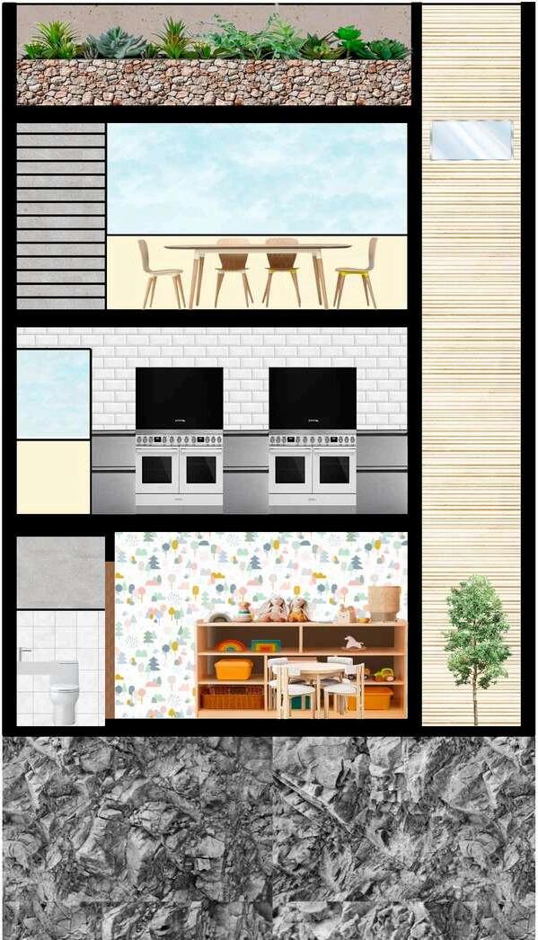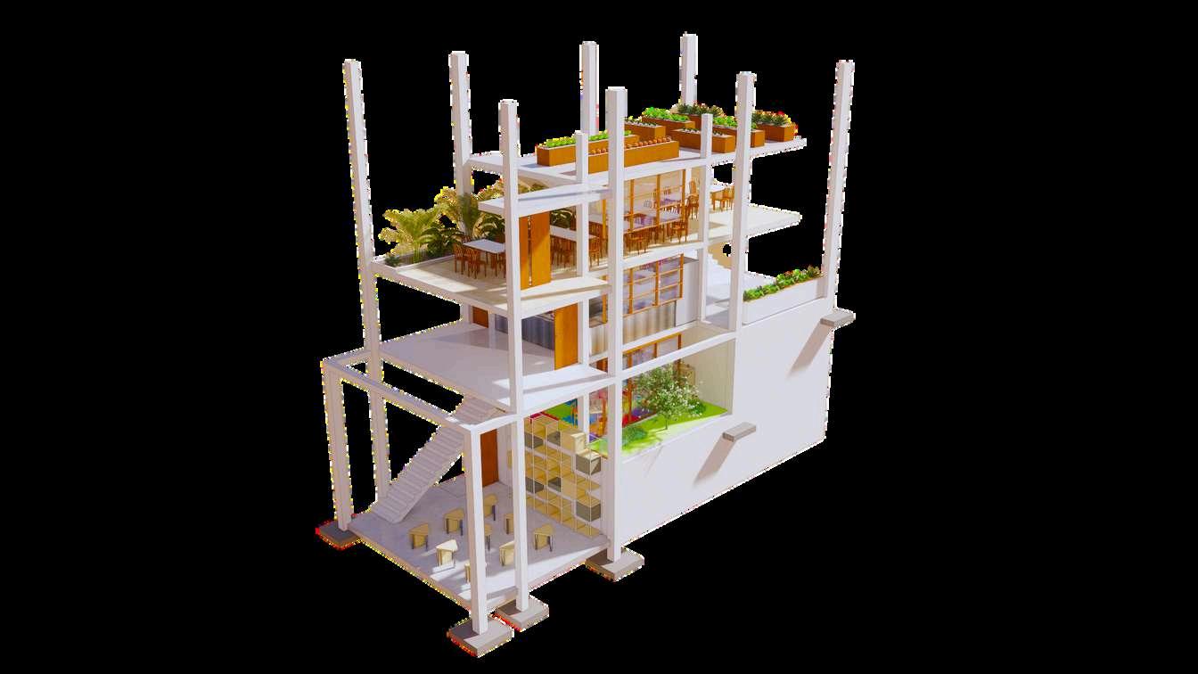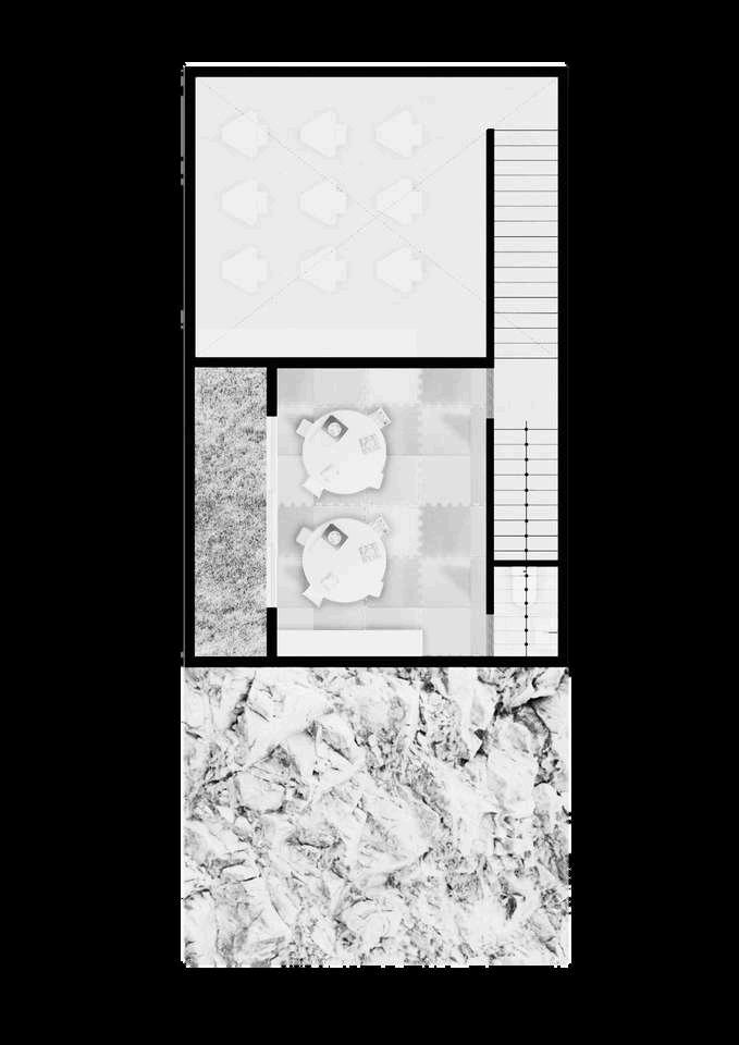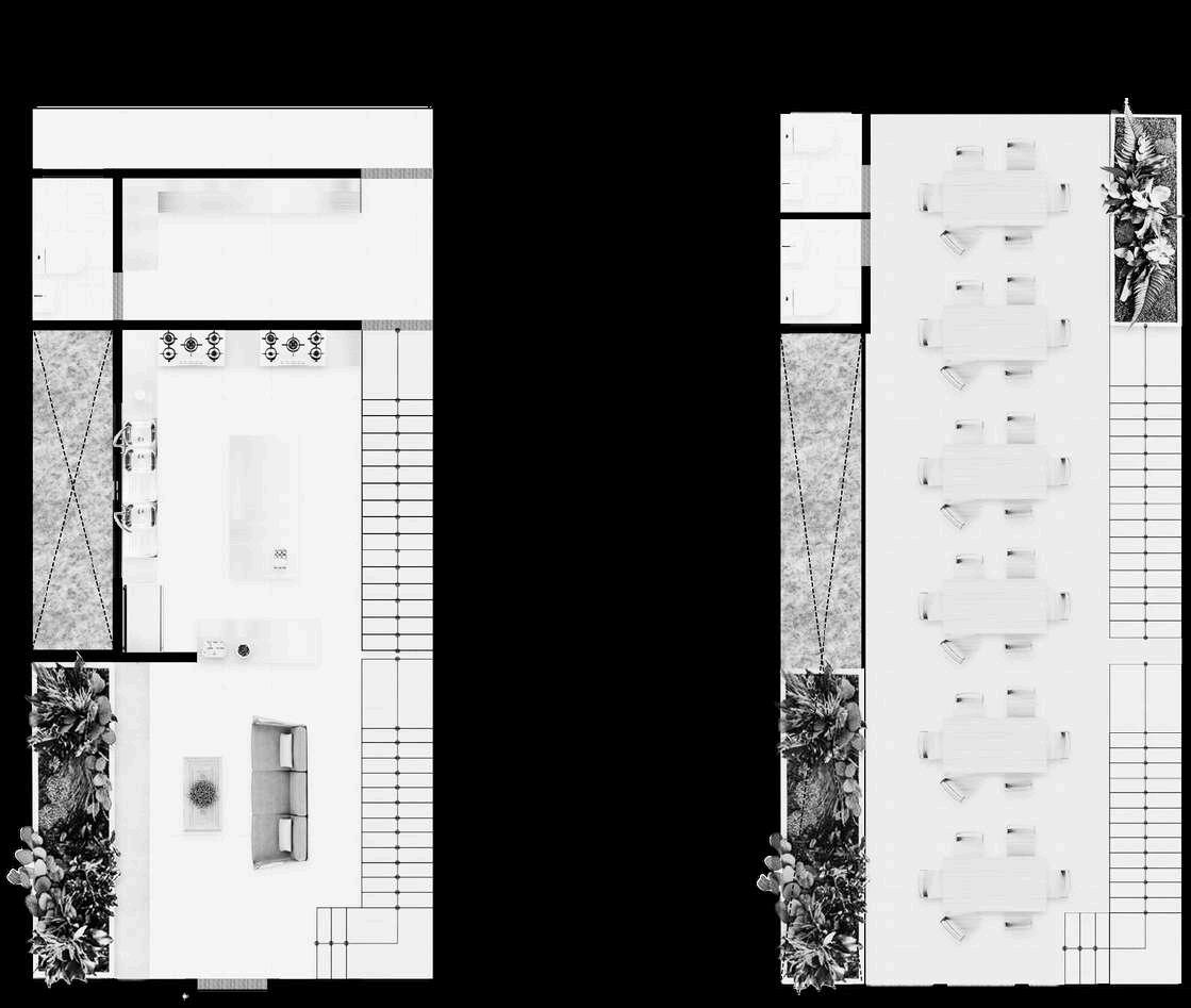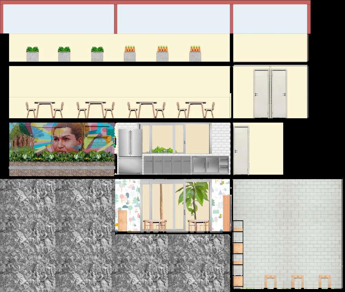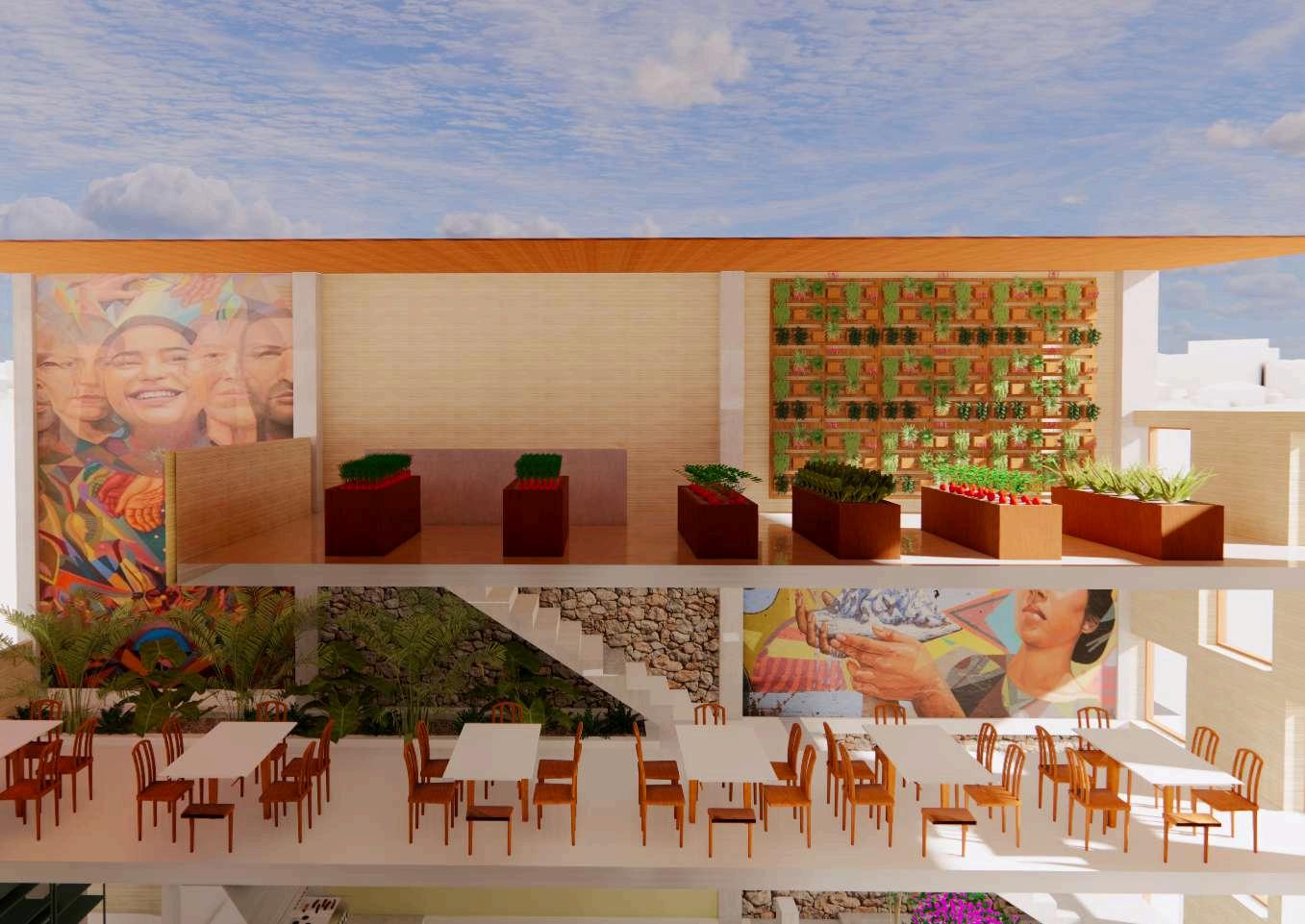 La segunda planta continúa con la lógica de los desniveles. En el primer desnivel se encuentra el comedore y en el segundo la cocina, que es el corazón del proyecto, donde se preparan los alimentos que se distribuirán a los beneficiarios.La tercera planta, están ubicados el biohuerto, comedor y almacén en su respectivo desnivel. Finalmente en la cuarta planta, están ubicados en el segundo desnivel, un biohuerto y en el tercero, una terraza.