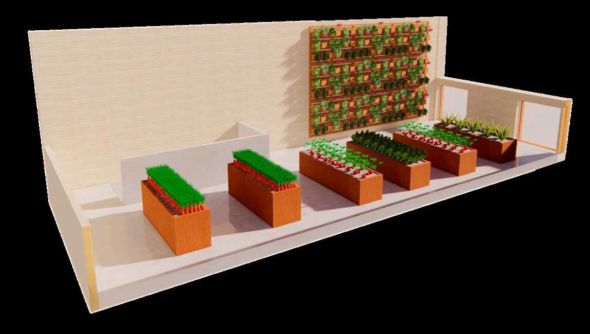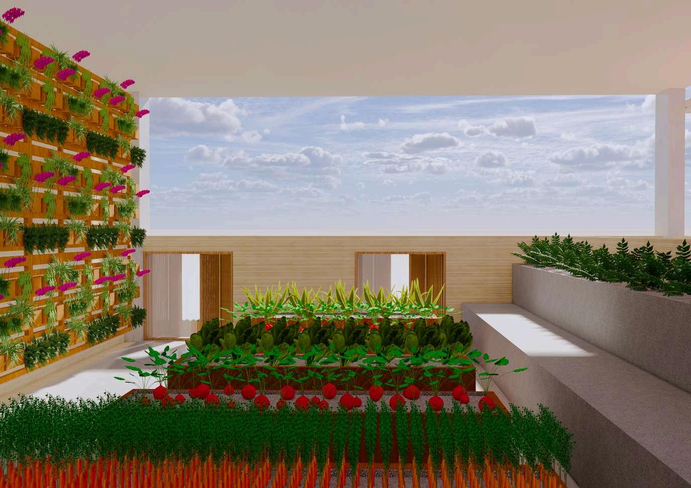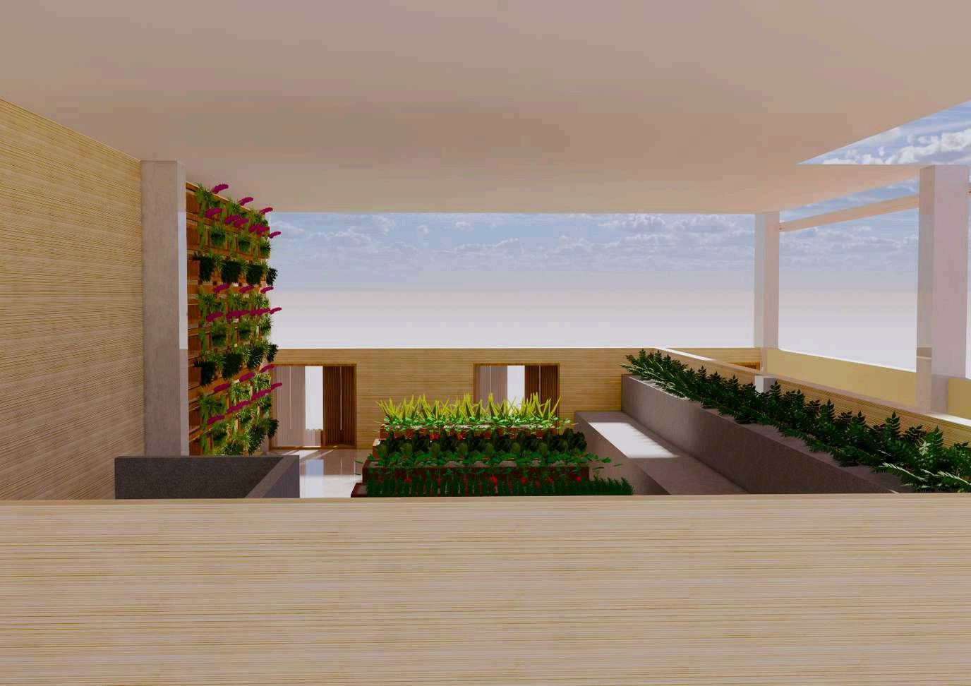 En cuanto a la infraestructura verde, el proyecto incluye una terraza destinada a biohuertos, donde se cultivan lechuga, rabanitos, zanahoria enana, aloe vera y espinaca, todos seleccionados por su adaptación al clima de Pesqueda. Estos cultivos no solo optimizan el uso del espacio disponible, sino que también contribuyen a la sostenibilidad del proyecto. También, se ha integrado un muro verde, que no solo mejora la estética del entorno, sino que también contribuye a la purificación del aire y a la regulación térmica del edificio. Además, el proyecto cuenta con jardines que albergan una variedad de plantas ornamentales como helechos, cuna de Moisés, kentia y ficus lyrata. Estos espacios verdes promueven el bienestar y la conexión con la naturaleza dentro del entorno urbano.