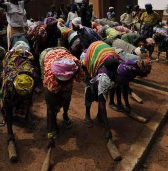 5.Con el apoyo de la comunidad, la construcción de la escuela comenzó. Los residentes de Gando aportaron mano de obra voluntaria y materiales locales, como ladrillos de adobe.