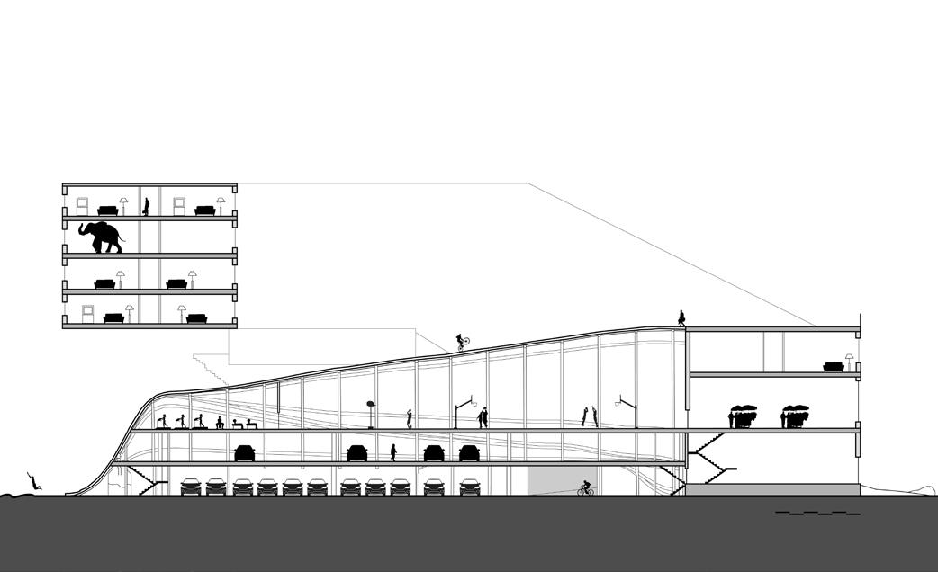 On the plinth level there is a grocery store, cafe and open dinning space for residents and the public to use. For those who desire to take flight through the elevated parks, a monumental staircase guides their path up through four levels.