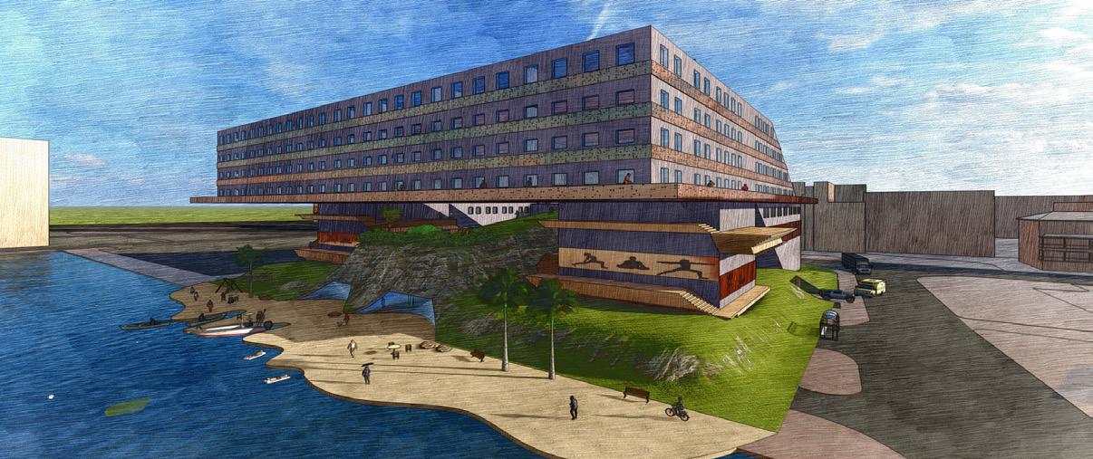This project is on the coast of Lake Michigan in Hyde Park, Chicago. Primary features of this design include an elevated park and shared green bridges, enclosed botanical garden, local amenities and more. The function of this design is an environmental affordable housing complex. The program contains, classrooms, grocery store, farmers market, office space, outdoor seating, recreational areas, and restaurants. In the red honey comb cores of the building, residents and the public have spectacular views when traveling to upper floors. The goal of this design is to construct an environmentally conscious building that connects to the existing parks on the green strip of Chicago.