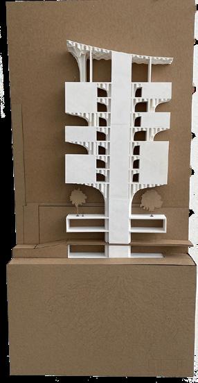 The section relief model highlights the design’s parti. Due to close proximity to the University of Chicago, the main users we are assisting are college students. The section of choice is taken from the south building that houses these students. The model highlights the red honey comb trees, starting with the stem underneath, growing through the roof, and permeating from the core between.