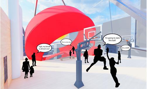 Urban planning outline / Work and Play is a 150,000 square foot office building with eight floors in Chelsea, Manhattan NY. Our building is located between the High Line and 10th Avenue. Play Core / To incorporate play into our Work and Play, we designed a play core that has various types of ‘play’ in each of its play ball on each floor. Each play ball has a interactive play theme for a fun activity.