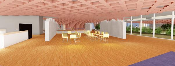 Once inside, the guest are drawn towards a double height space. While they spend their time in this building, they will witness the changing of spaces in action as walls dance around rails on the ceiling, dropping into place on the floor to create a new program. The furniture design using CNC joinery that allows for repeated assembly and breakdown with no tools required, making it easy to reconfigure layouts to suit the use of any space.