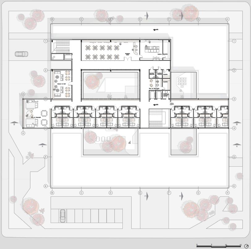 Conceito: Incorporar aos espaços o valor e a identidade do paciente, humanizando o ambiente clínico e acolhendo indivíduos em um momento sensível. Composição volumétrica: Os pátios propostos no interior da edificação implicam na integração com os blocos dispostos, cada bloco possui uma função específica no tratamento oncológico, alhando em conjunto para as diferentes etapas da medicação. No eiro pavimento, estão localizados os blocos de cuidado, com salas consulta, tratamento e acompanhamento, visando uma maior gração entre os pacientes, funcionários e visitantes. No segundo ar, encontra-se o bloco de repouso, com refeitório, espaços de r, área de observação e dormitórios, proporcionando descanso e peração para os pacientes em um bloco afastado da recepção aior ruído ). A disposição dos blocos de forma integrada e s através dos pátios internos também facilitam a circulação ação dentro da edificação, tornando o ambiente mais acolhedor.
