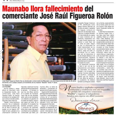 En el caso de Figueroa Rolón, este era un reconocido comerciante que durante 40 años tenia varios en la región sureste como ejemplo el JRF Cash & Carry en Maunabo, y el Gomazo en Humacao entre otros negocios. El día 24 de mayo de 2023, “Raulito” como se le conocía, fue a Maunabo a firmar el traspaso de JRF Cash & Carry a Axel Leon, dueño de Maunabo Auto Parts, que queda contguo al supermercado y luego de la firma del mismo se dirigía a su hogar en Fajardo cuando tuvo un percance en el cual choca con un poste con cable de telefonía cae encima del retrovisor de su Ford Transit, pero al tratar de remover dicho cable un camión de Ranger American trato de pasarle pero sin darse cuenta de que Raulito se encontraba y lo arrolla de tal manera muriéndose en el acto.
