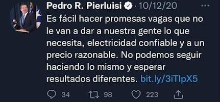 Como una vez escribió en Twitter el propio Pierluisi en el 2020 mientras estaba en la campaña a la gobernación: “Es fácil hacer promesas vagas que no le van a dar a nuestra gente lo que necesita: electricidad confiable y a un precio razonable. No podemos seguir haciendo lo mismo y esperar resultados diferentes”.