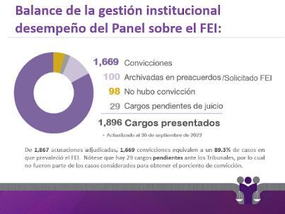 La presidenta del FEI detalló que los casos que maneja su oficina duran muchos años y cuándo llegan al tribunal, suelen dilatarse, pero que esto no significa que sean los fiscales quienes extienden esos casos. A manera de ejemplo mencionó el caso del expresidente de la Universidad de Puerto Rico Urayoán Walker y el extractor Carlos Severino, que duró casi 5 años y el FEI lo perdió. El caso de la exsenadora popular Mari Tere González, quien se declaró culpable, duró unos seis años. Al 30 de septiembre de 2022 el FEI ha presentado 1,896 cargos de los cuales han logrado 1,669 convicciones, 100 casos archivados en preacuerdos, 98 casos donde no hubo convicción y 29 cargos pendientes de ir a juicio.