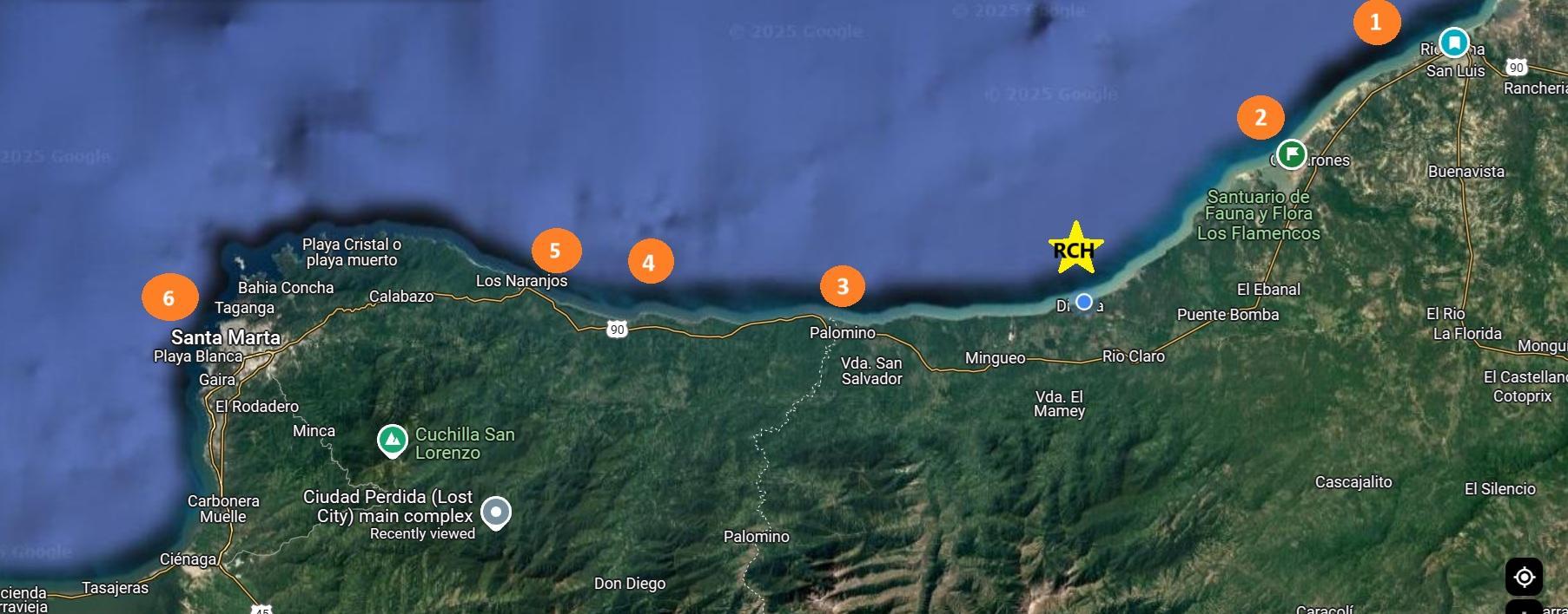 1. Just 45 minutes away from Riohacha airport, 2. 40 minutes away from the Flamingo Natural Sanctuary, 3. 25 minutes away from Palomino, 4. 50 minutes away from the starting point of Lost city trek, 5. 60 minutes away from the Tayrona National Park entrance, 6. 2 hrs away from Santa Marta.