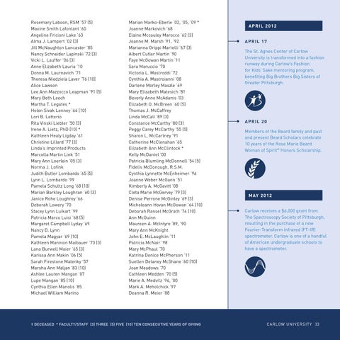 Marian Marko-Eberle ’02, ’05, ’09 * Joanne Markovich ’68 Elaine Mccauley Marocco ’62 (3) Jeanne M. Marsh ’91, ’92 Marianna Grippi Martelli ’67 (3) Albert Cutler Martin ’90 Faye McGowan Martin ’11 Sara Maruccio ’70 Victoria L. Mastroddi ’72 Cynthia A. Mastroianni ’08 Darlene Morley Maszle ’69 Mary Elizabeth Matesich ’81 Beverly Anne McAdams ’03 Elizabeth O. McBreen ’60 (5) Thomas J. McCaffrey Linda McCall ’89 (3) Constance McCarthy ’80 (3) Peggy Carey McCarthy ’55 (5) Sharon L. McCartney ’91 Catherine McClenahan ’65 Elizabeth Ann McClintock * Kelly McDaniel ’00 Patricia Blumling McDonnell ’54 (5) Fidelis McDonough, R.S.M. Cynthia Lynnette McEnheimer ’96 Joanne Weber McGann ’51 Kimberly A. McGavitt ’08 Cleta Marie McGervey ’79 (3) Denise Perrone McGinley ’69 (3) Micheleann Hovan McGowan ’64 (10) Deborah Ransel McGrath ’74 (10) Ann McGuinn Maureen A. McIntyre ’89, ’90 Mary Ann McKnight John E. McLaughlin ’11 Patricia McNair ’98 Mary McPhaul ’70 Katrina Denice McPherson ’11 Suellen Delaney McShane ’60 (10) Joan Meadows ’70 Cathleen Medden ’70 (5) Marie A. Medvitz ’96, ’00 Mark A. Meholchick ’97 Deanna R. Meier ’88