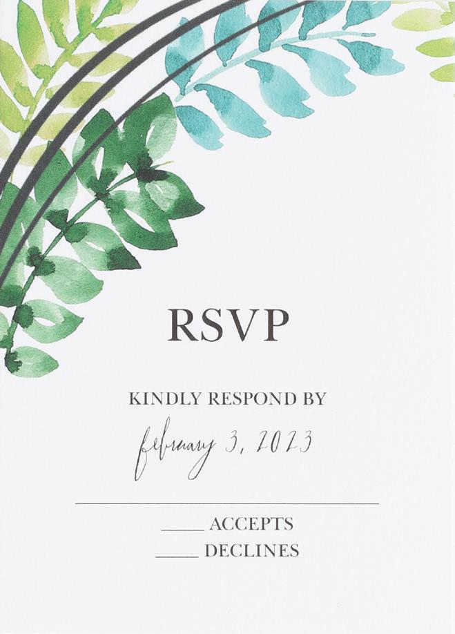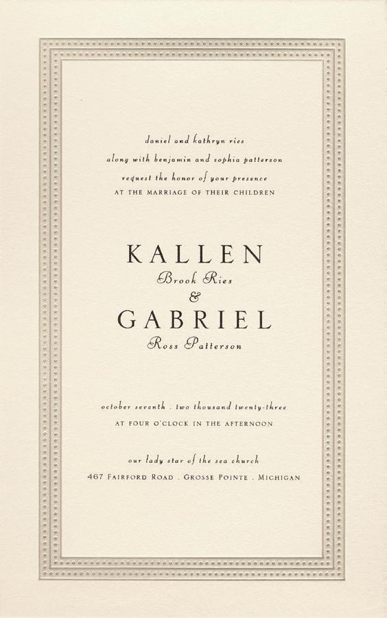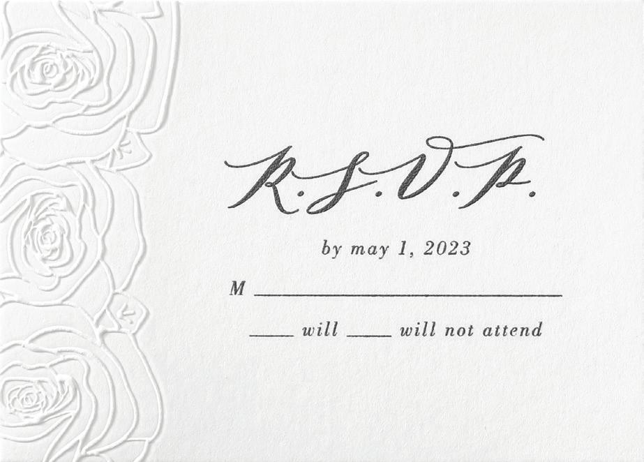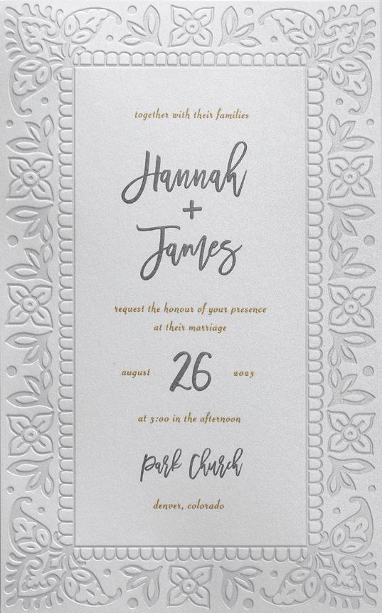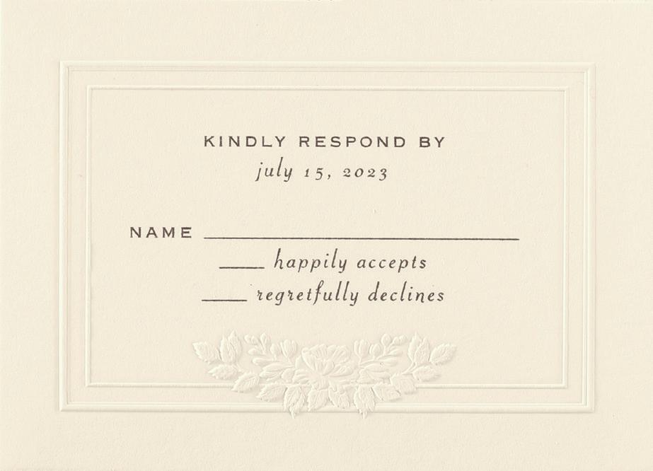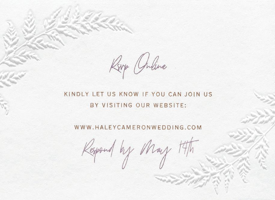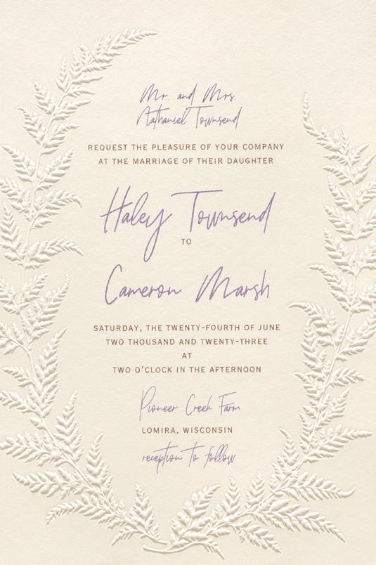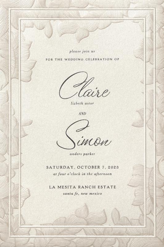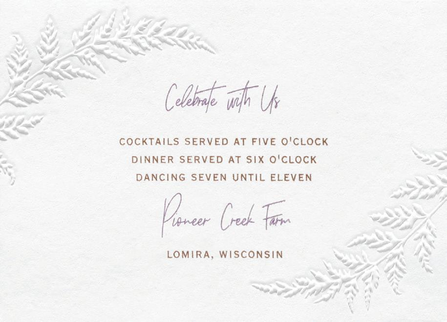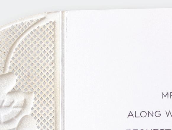 The spring Classic Collection offers two beautiful paper stocks in white or ecru for all invitations (excluding the Navy Feather Deckle invitation and reception card on page 5).