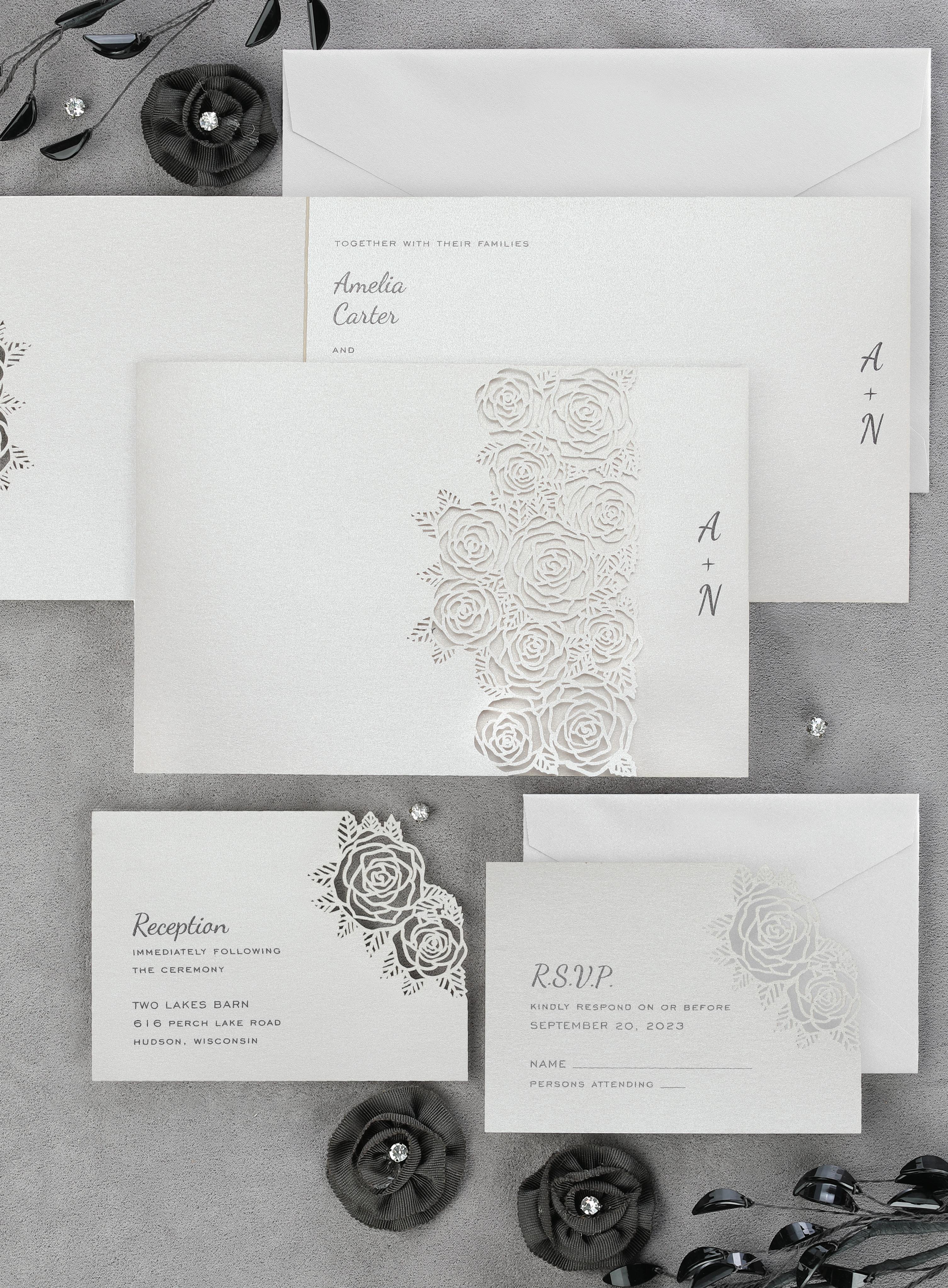 Couples seeking simple elegance will love the Classic Collection. These invitations make an impressive statement with timeless, refined pieces and stylish extras like detailed embossing, sophisticated borders, deckled edges and foil stamping. Be sure to check out the translucent vellum wrap on page 7 and the laser cut rose design on page 13!
