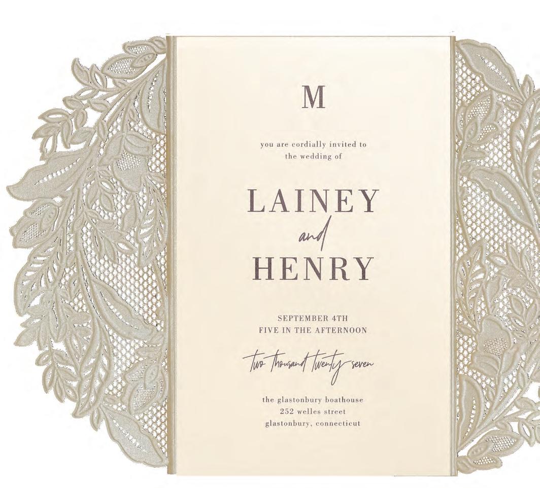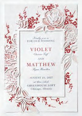 The Luxe Collection lets brides immerse themselves in exquisite papers, upscale designs and sophisticated layouts, all available in larger sizes. Special touches like layers, pockets, ribbons, and laser-cut wraps elevate their invitations to a new level of luxury.