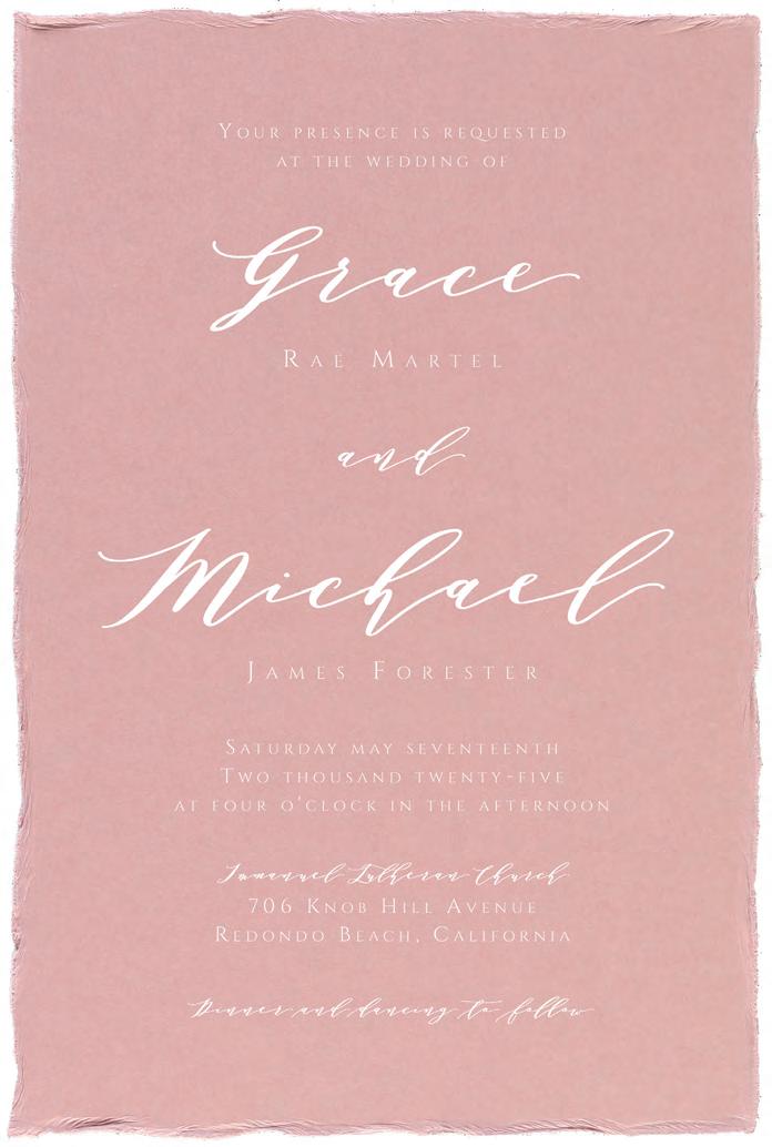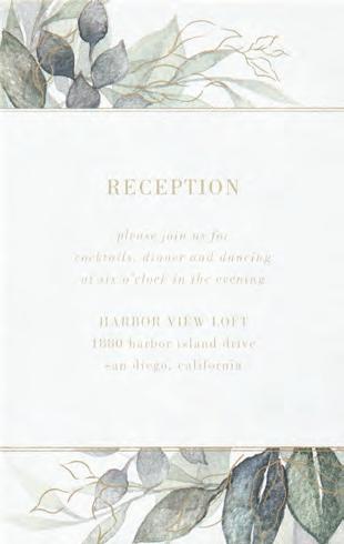 Couples seeking simple elegance will love the Classic Collection. These timeless and sophisticated invitations feature stylish extras like detailed embossing, sophisticated borders, deckled edges, shimmering foil stamping. They can complete the look with coordinating envelope liners (see liner sizes on pages 102-103) and elegant shimmer paper pockets in white, ecru, black or navy. New this year, customers can choose 110 lb. vellum or 110 lb. or 220 lb. fluorescent white or pearl white cotton paper for letterpress or deckle letterpress invitations.