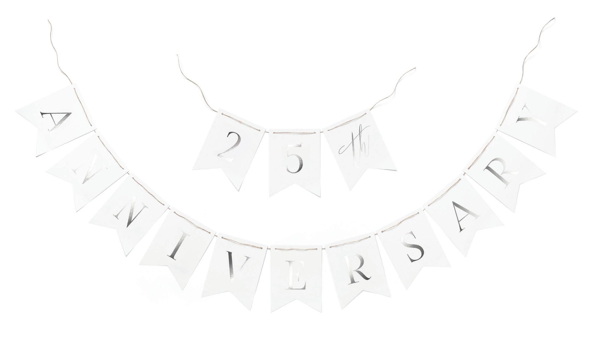 25TH ANNIVERSARY BANNER Silver foil shown. 14 flags with jute cord included. ZBK69779 $14.90