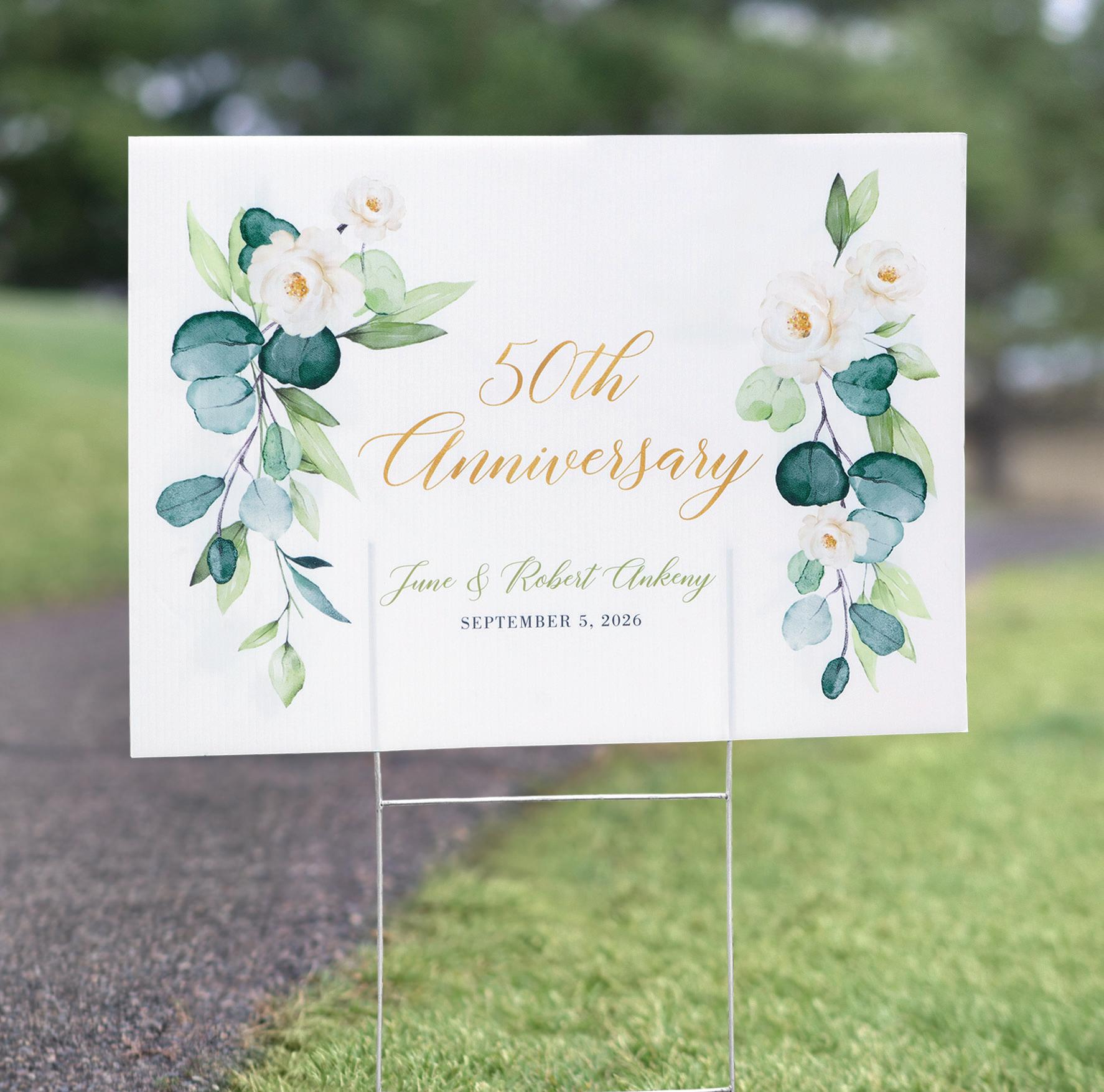 Celebrate a love that has stood the test of time with the beautiful watercolor floral design of decorations featuring white roses, a symbol of everlasting love.