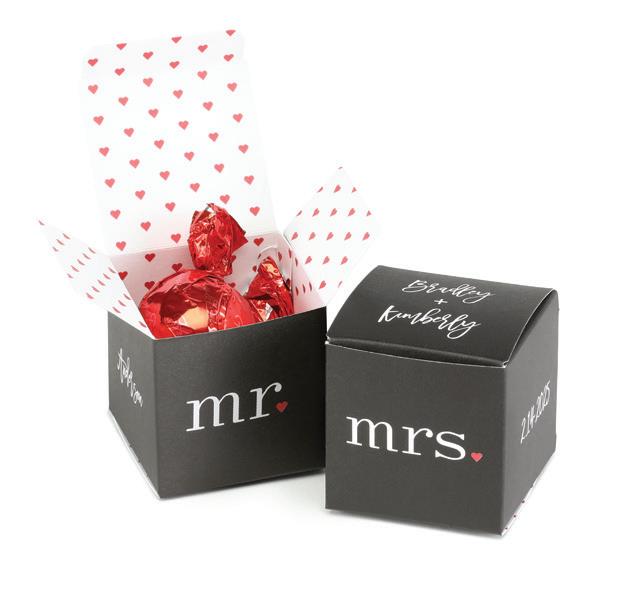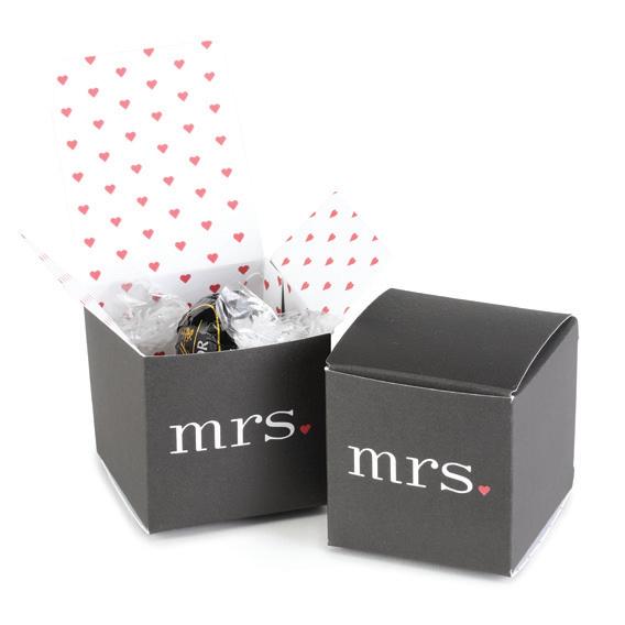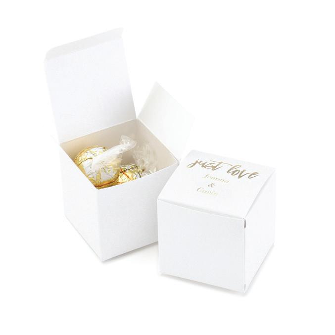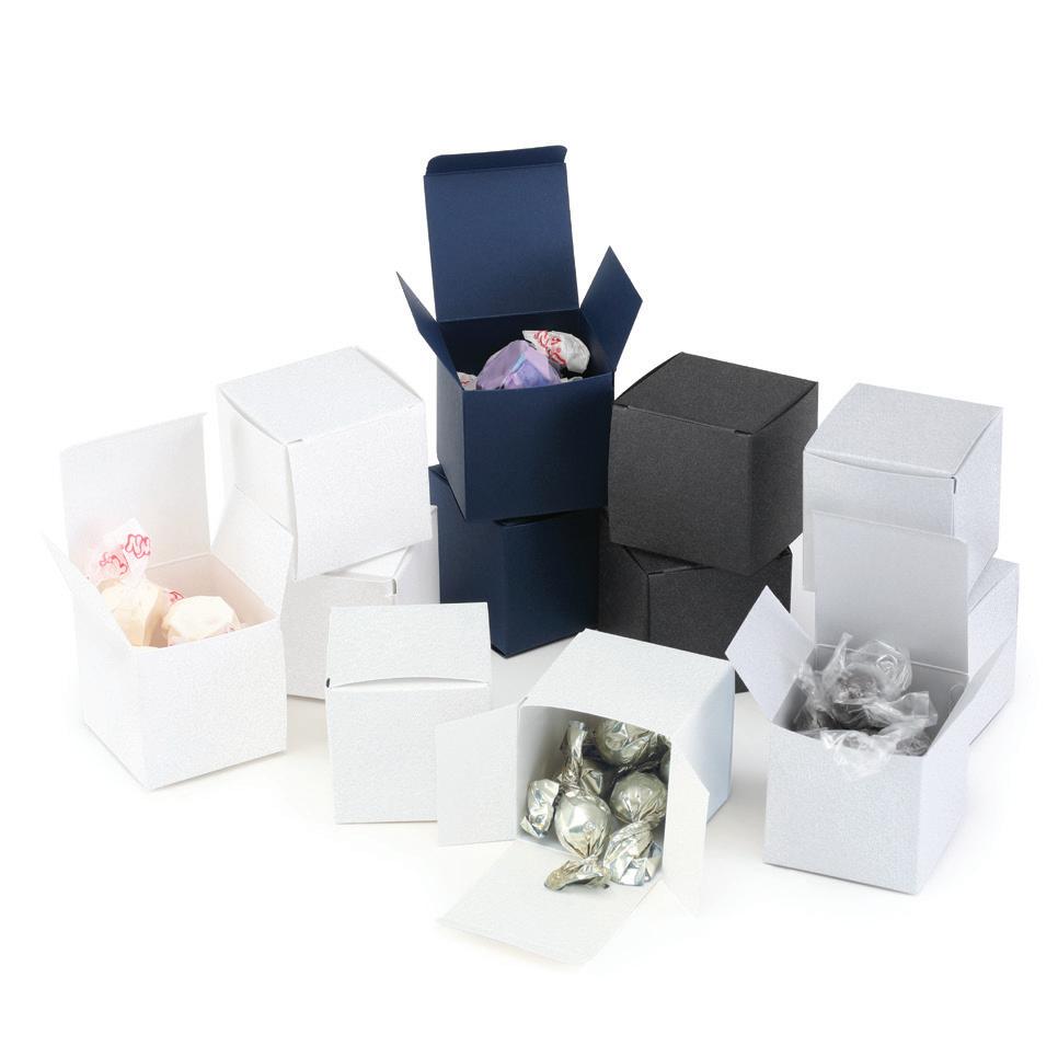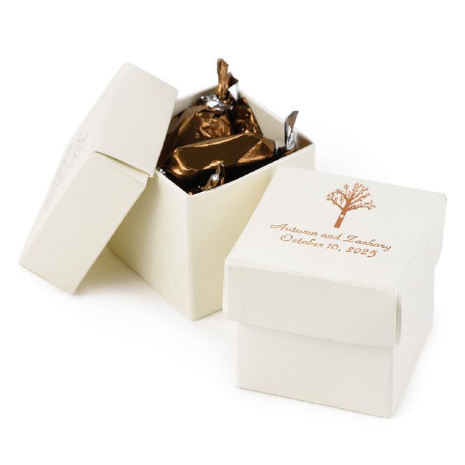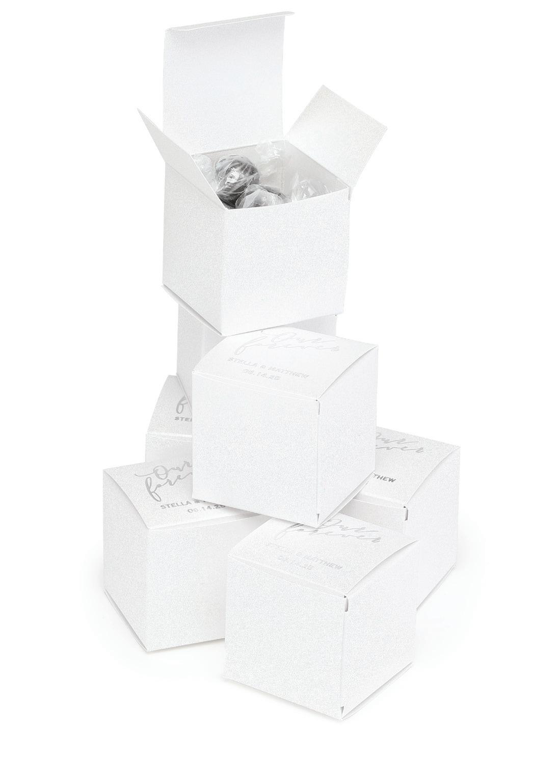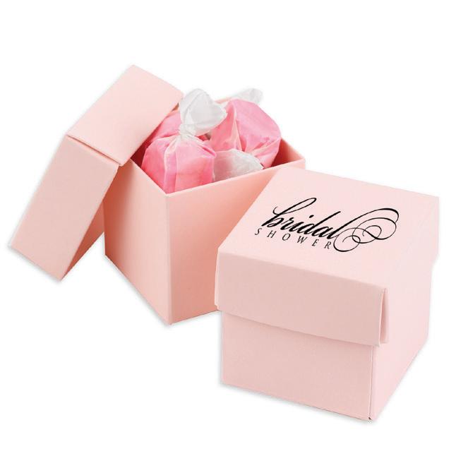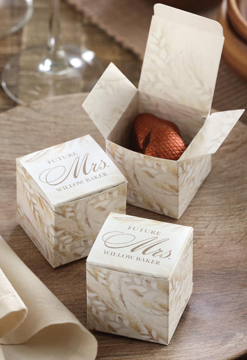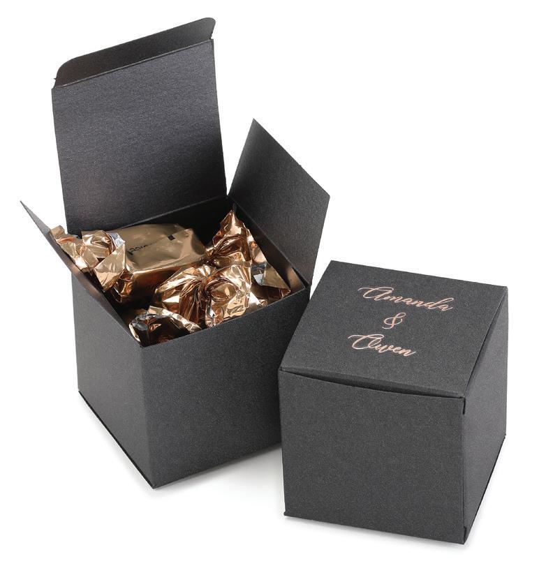 SQUARE FAVOR BOXESPERSONALIZED Rose Gold foil and Brunella Script font shown on black shimmer paper. 5 paper color options. Package of 25. ZBK62232P $50.90