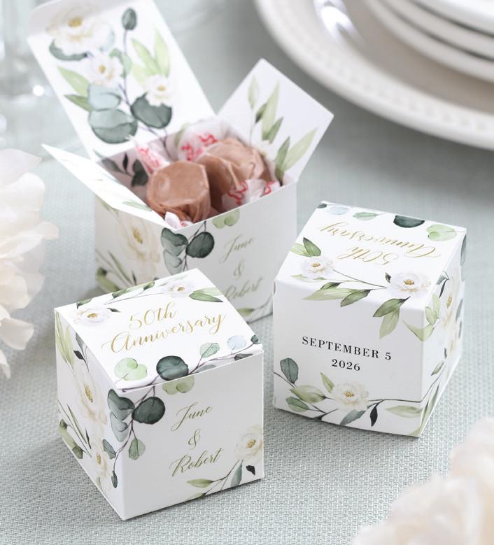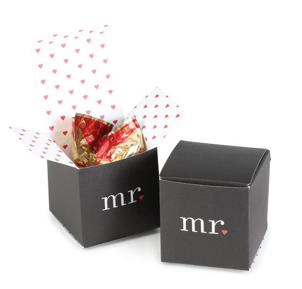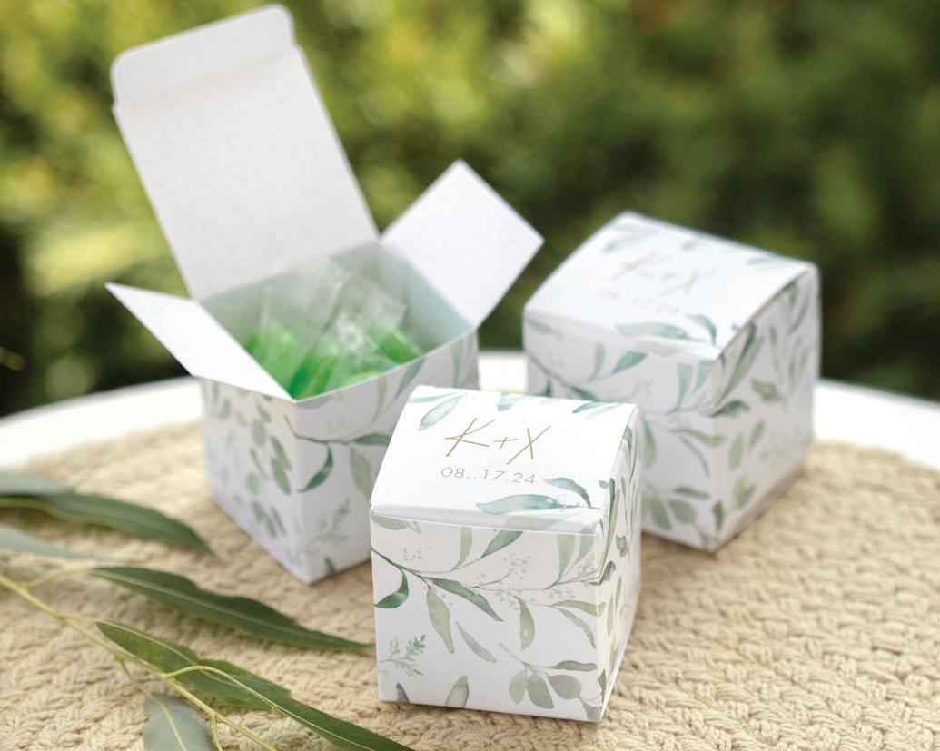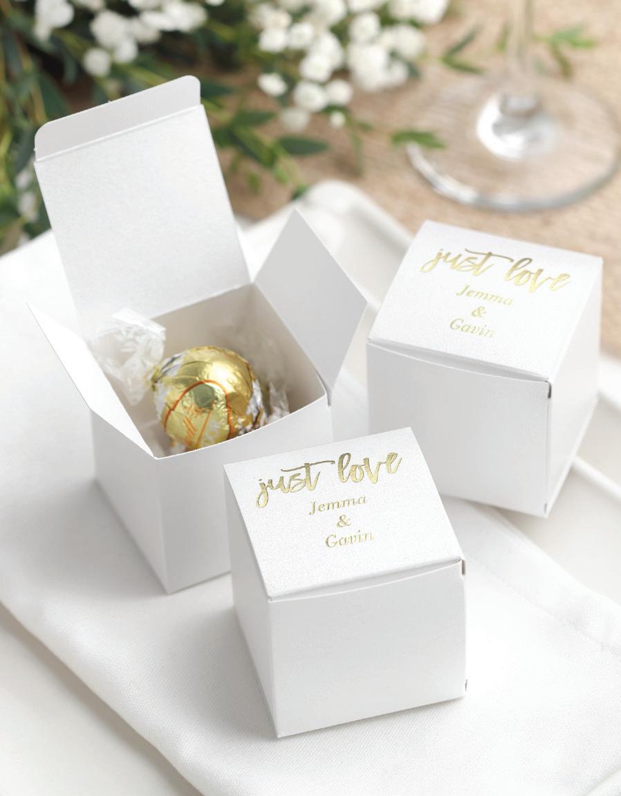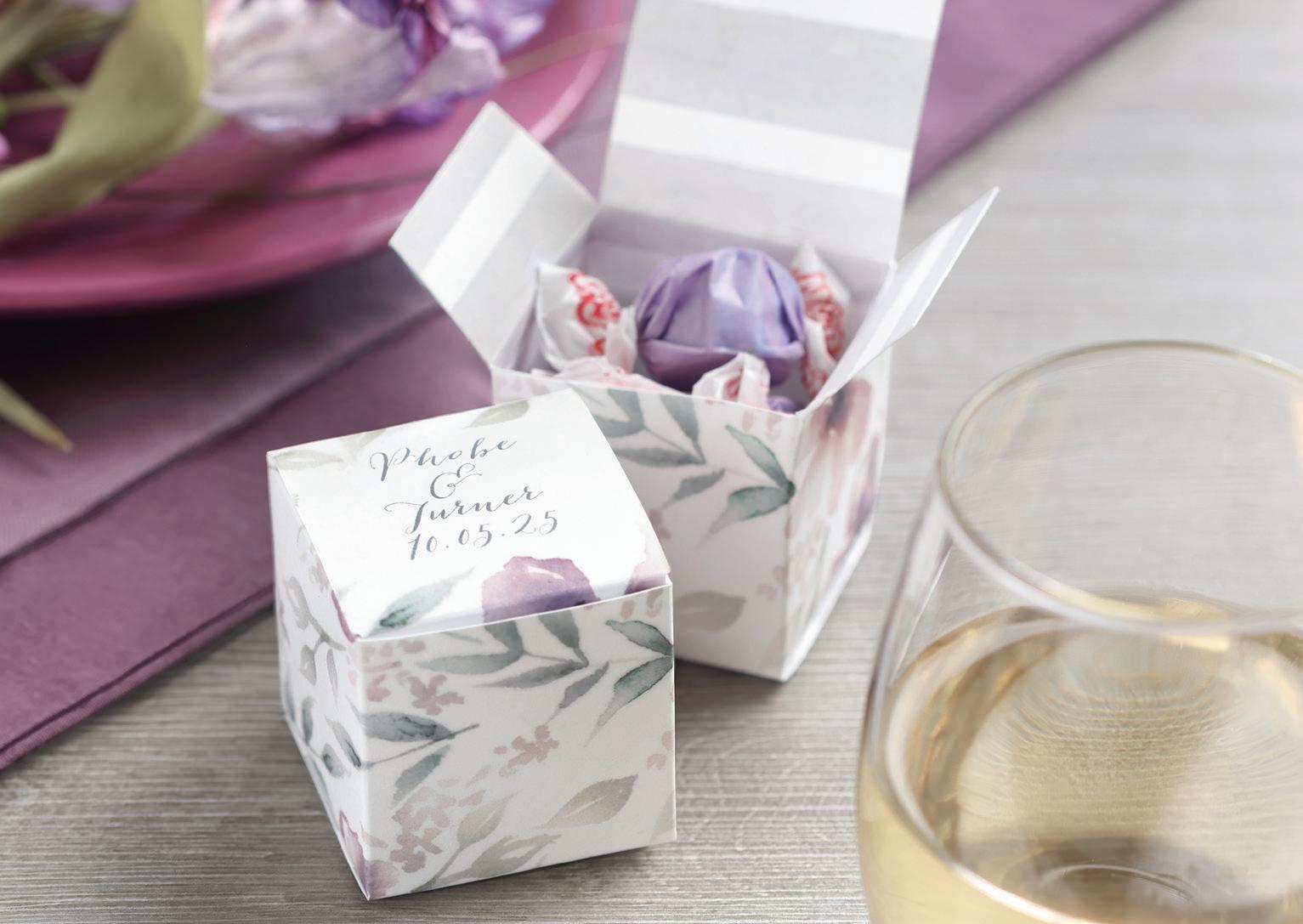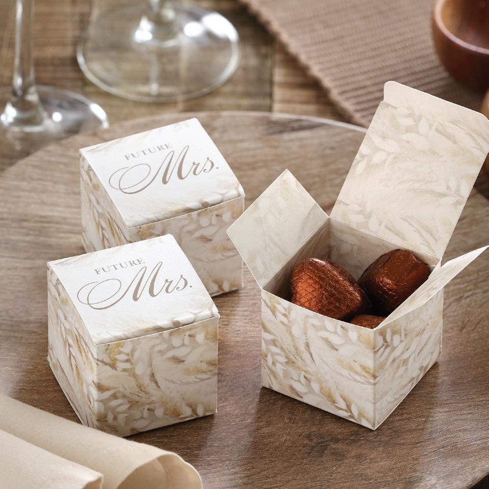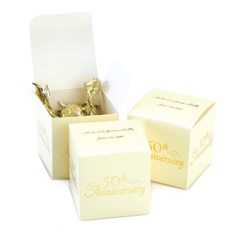 SQUARE FAVOR BOXESPERSONALIZED Rose Gold foil and Brunella Script font shown on black shimmer paper. 5 paper color options. Package of 25. ZBK62232P $50.90