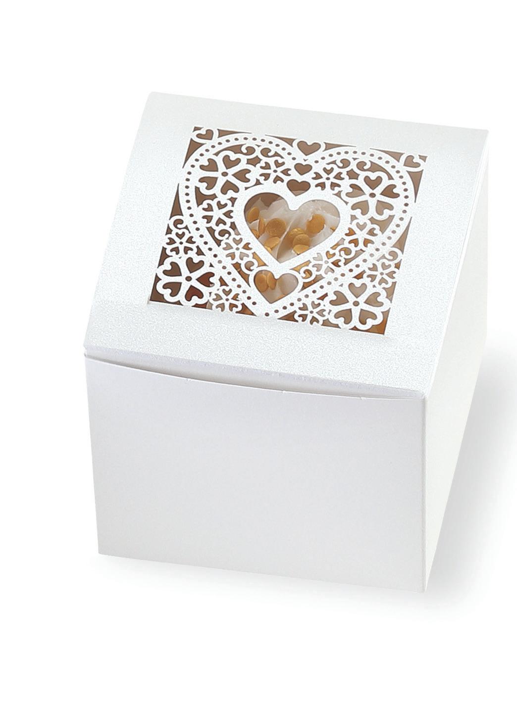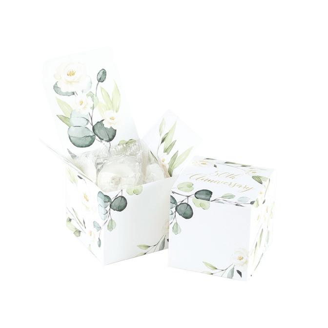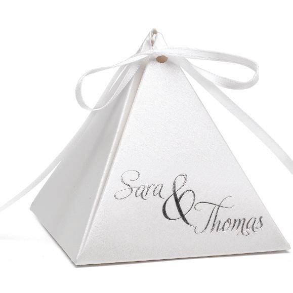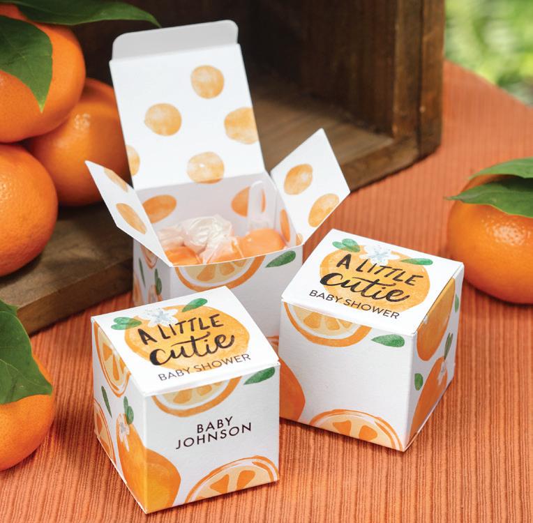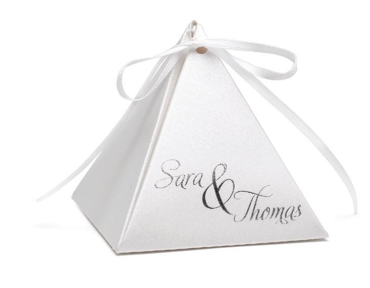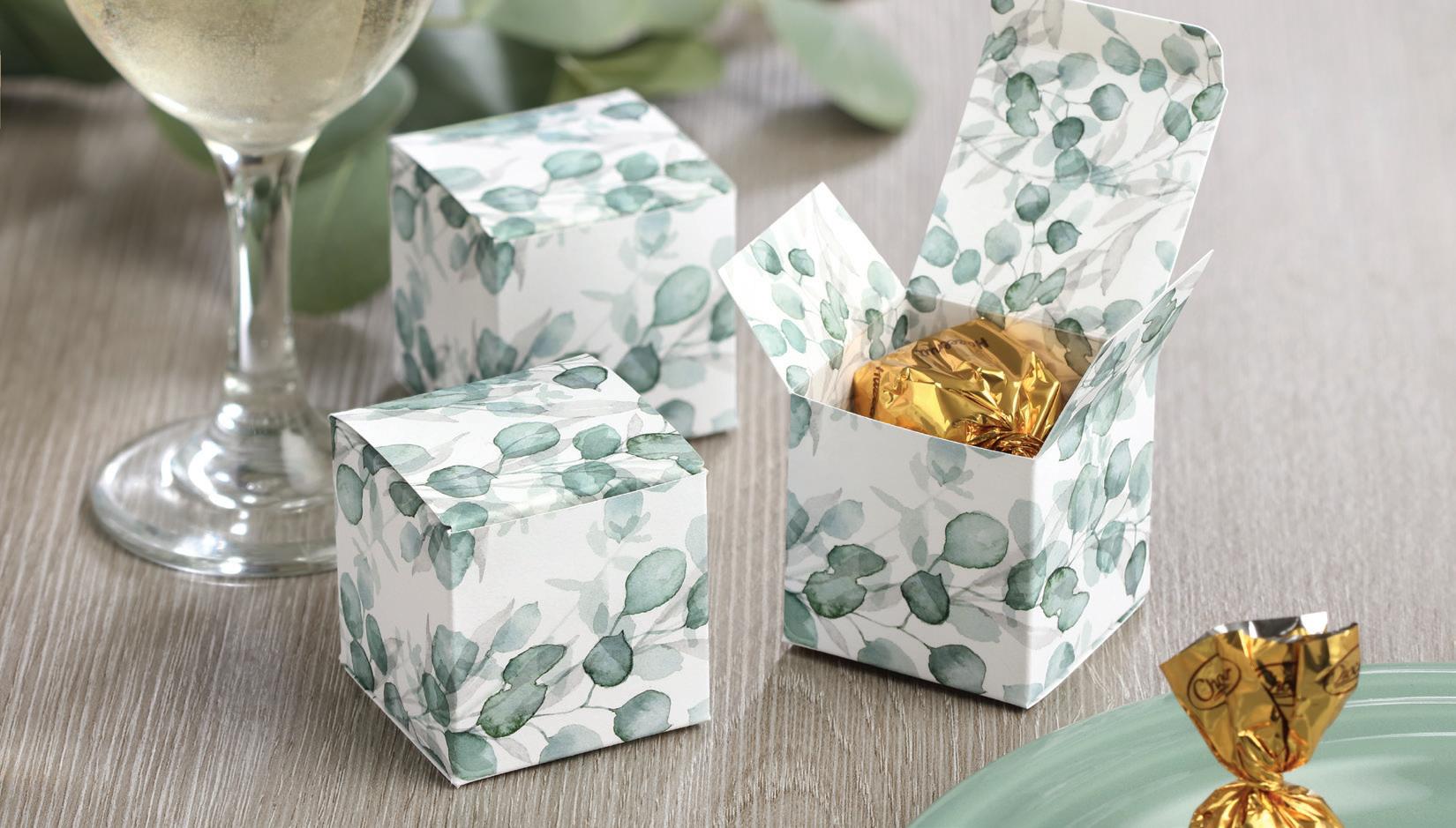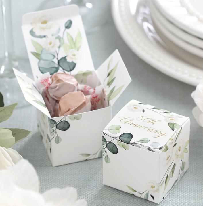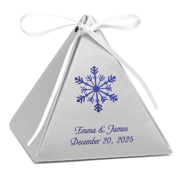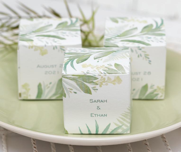 SQUARE FAVOR BOXESPERSONALIZED Rose Gold foil and Brunella Script font shown on black shimmer paper. 5 paper color options. Package of 25. ZBK62232P $50.90