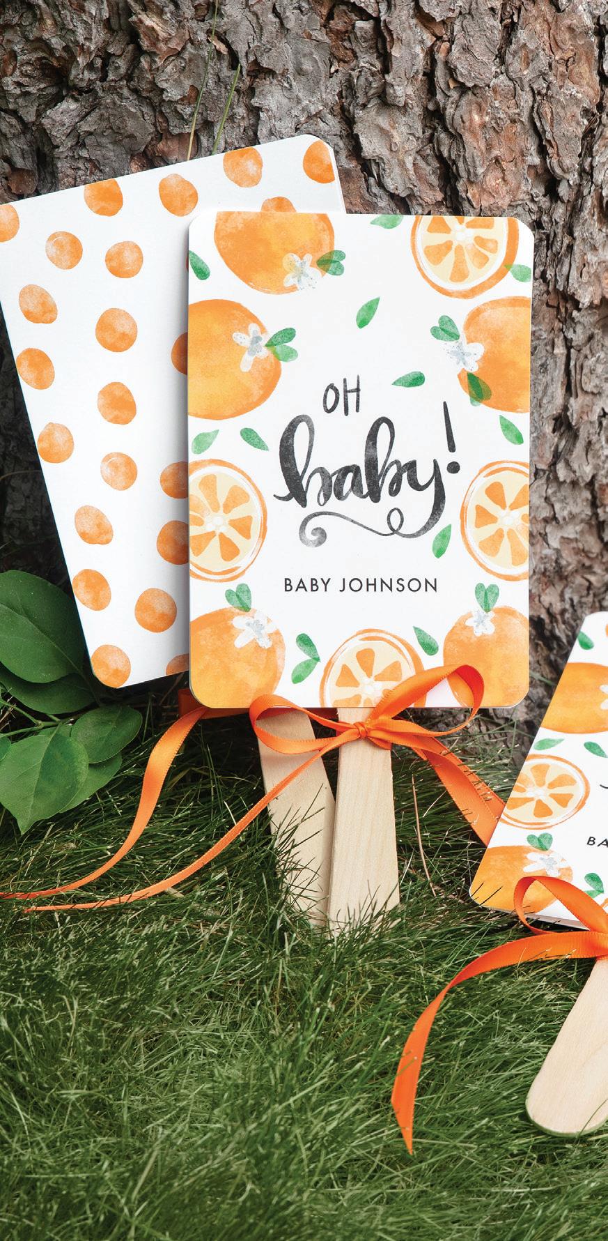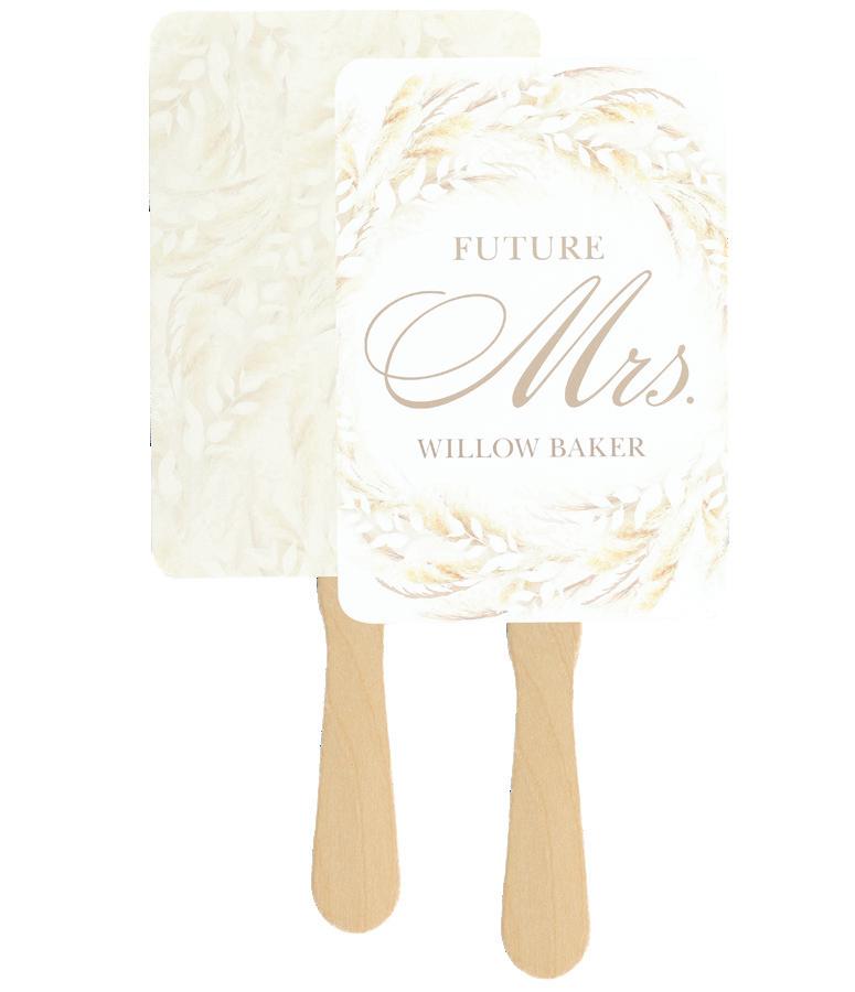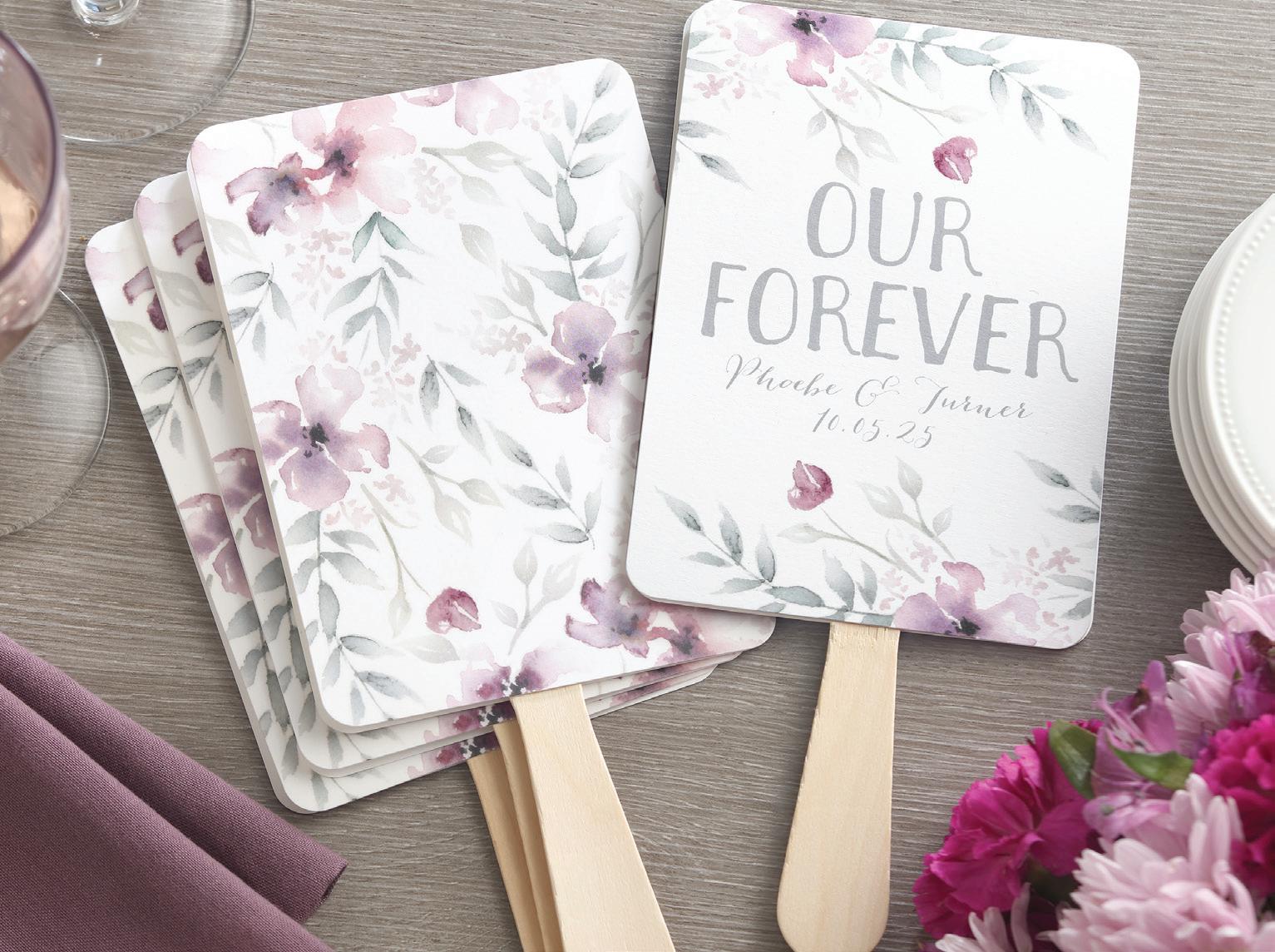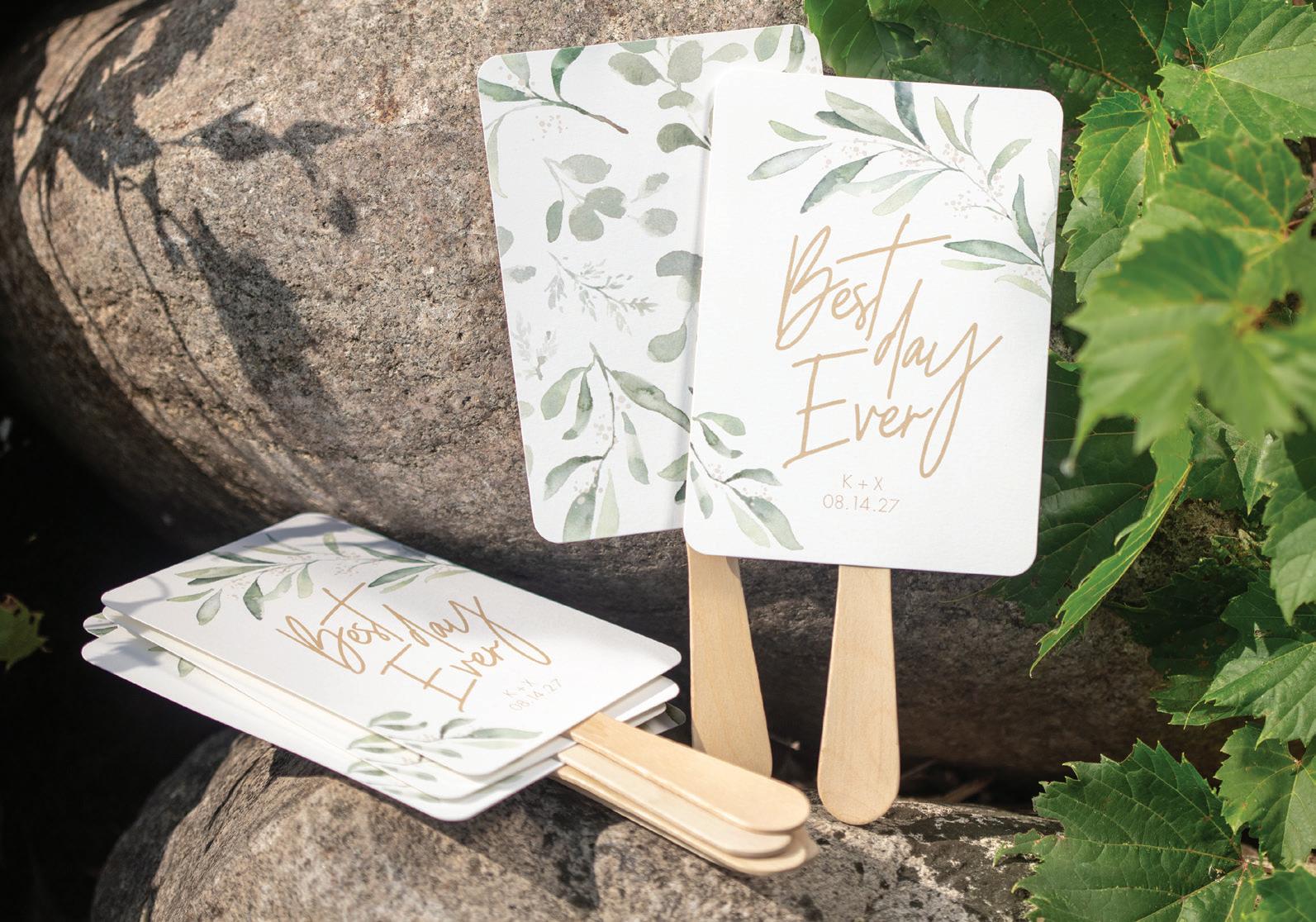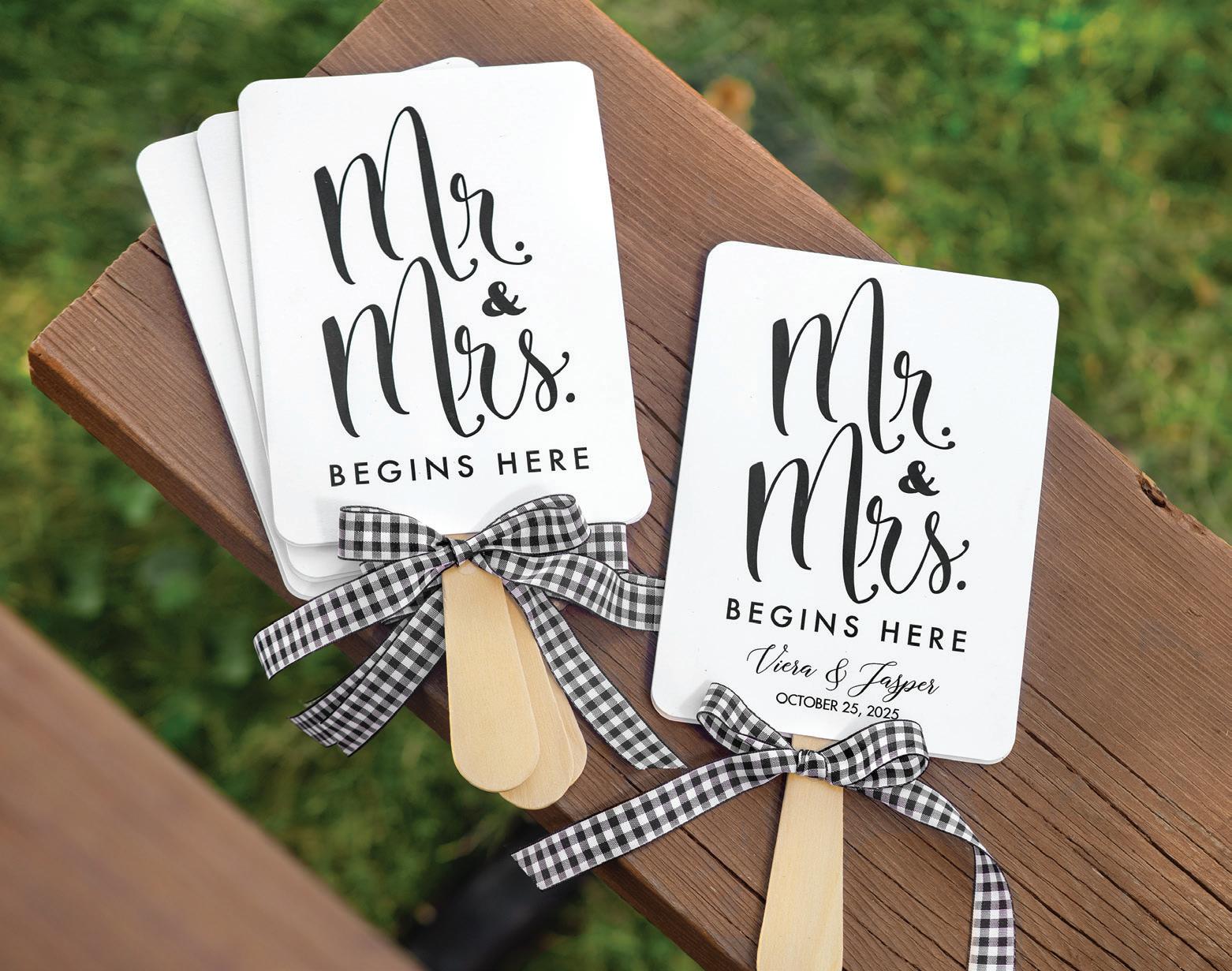 To personalize see pages 167 and 168. ChampagneNU ink and Futura Light font shown. Customer assembly required. Each favor fan consists of two, 5" x 7" cards, a wooden handle and glue dots. Package of 25.