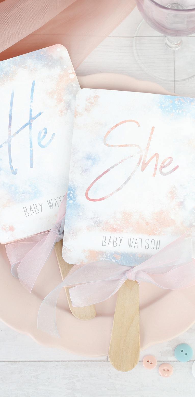To personalize see pages 167 and 168. Platinum ink and Bombshell font shown. Customer assembly required. Each favor fan consists of two, 5" x 7" cards, a wooden handle and glue dots. Package of 25.