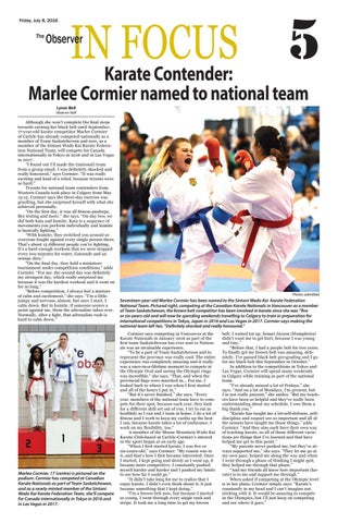 belt. I waited tot up. Sensei Jayson (Humphries) didn’t want me to get hurt, because I was young and tiny.” “Before that, I had a purple belt for two years. To finally get my brown belt was amazing, definitely. I’ve passed black belt pre-grading and I go for my black belt this September or October.” In addition to the competitions in Tokyo and Las Vegas, Cormier will spend many weekends in Calgary while training as part of the national team. “I’ve already missed a lot of Fridays,” she says. “And on a lot of Mondays, I’m present, but I’m not really present,” she smiles. “But my teachers have been so helpful and they’ve really been understanding about my schedule. I owe them a big thank you.” “Karate has taught me a lot-self-defense, selfdiscipline and respect are so important and all of the senseis have taught me those things,” adds Cormier. “And they also each have their own way of teaching karate, so all of those different variations are things that I’ve learned and that have helped me get to this point.” “My parents never pushed me, but they’ve always supported me,” she says. “They let me go at my own pace, helped me along the way and when I went through a phase of thinking I might quit, they helped me through that phase.” “And my friends all know how important (karate) is to me and support me through.” When asked if competing at the Olympic level is in her plans, Cormier simply says: “Karate’s constantly in my head and I can’t imagine not sticking with it. It would be amazing to compete in the Olympics, but I’ll just keep on competing and see where it goes.”