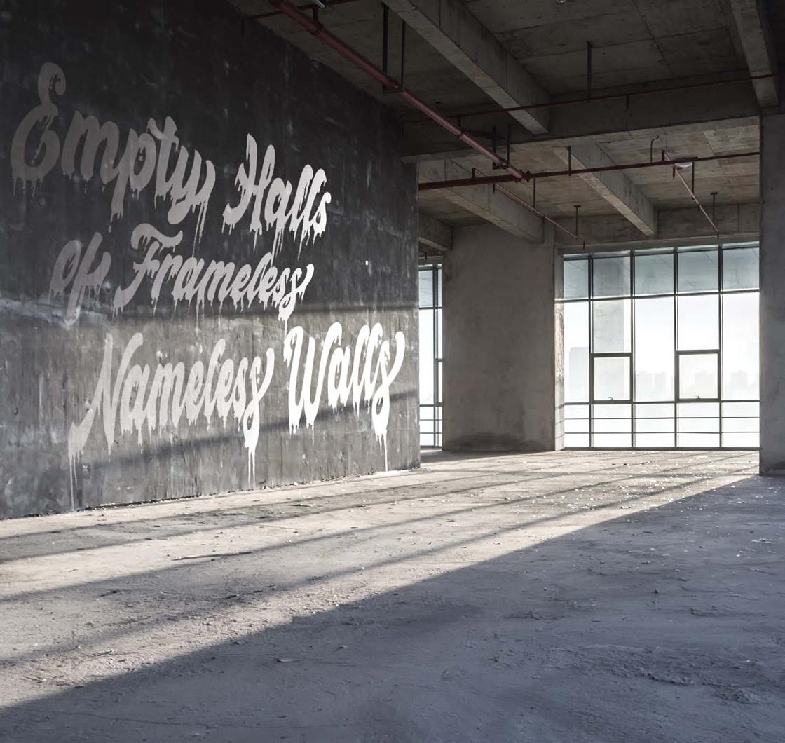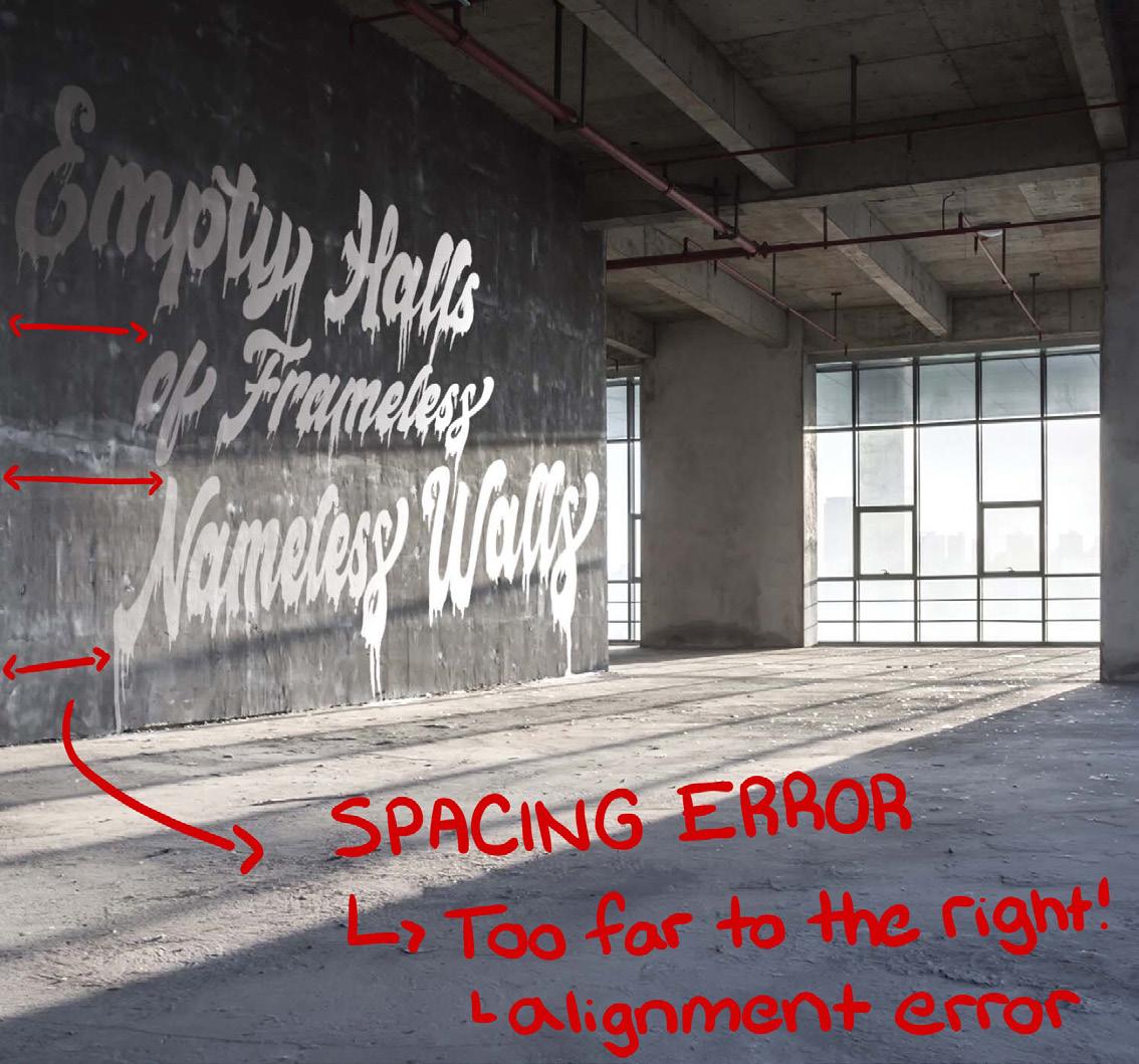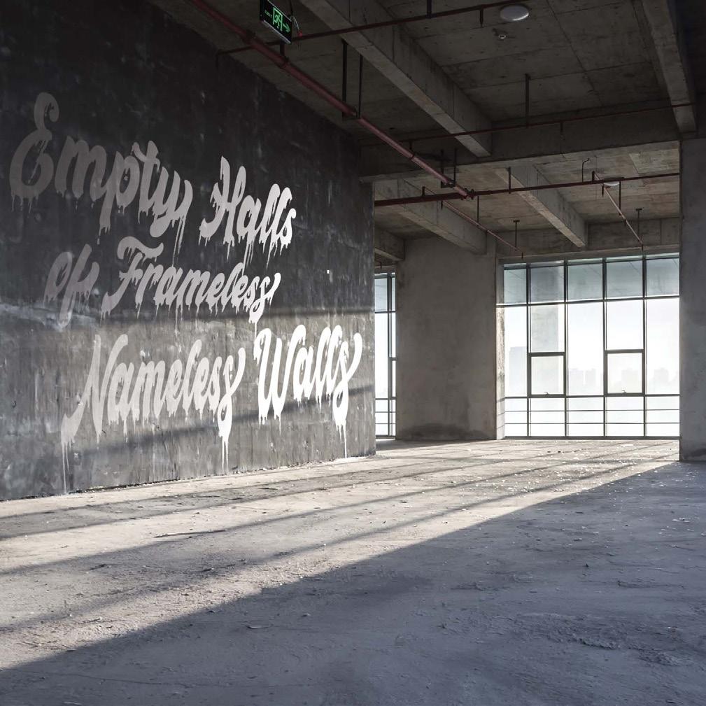 The second concept followed a similar process to the first concept by drawing inspiration from the song “Vincent” by Don McLean. The phrase “empty halls of frameless, nameless walls” was inspired by the lyrics “Portraits hung in empty halls. Frameless heads on nameless walls.” These lyrics not only display a satisfying rhythmic pattern but also allow the audience to experience visual imagery. By listening to the song many times, I imagined an empty warehouse in which a person decided to paint a phrase to make the space feel less empty. Similar to the first concept, the idea was critiqued and further developed using Photoshop.