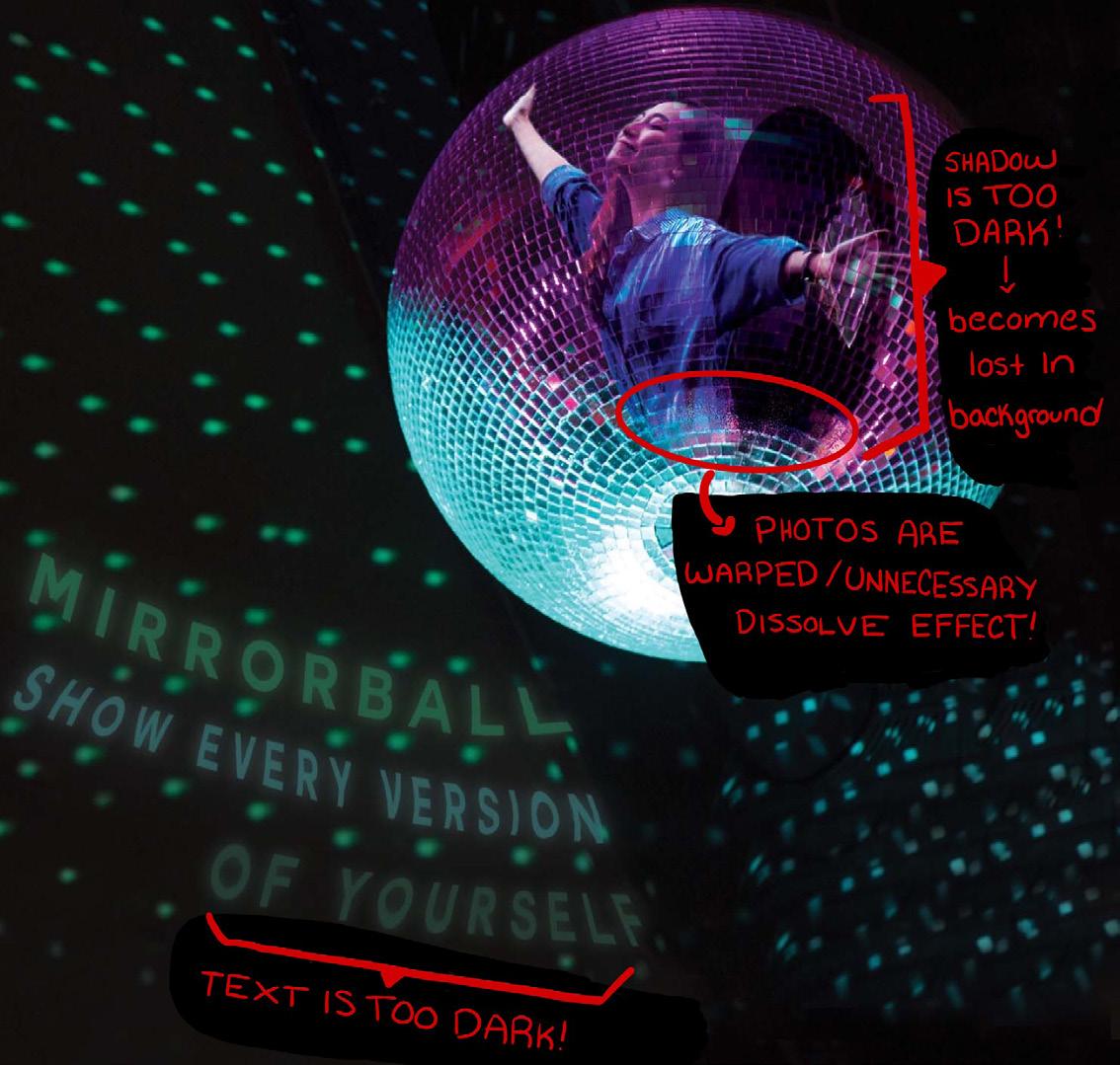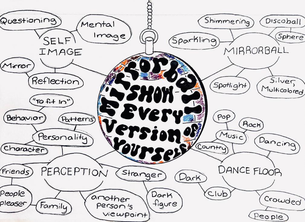 I first wrote down ideas to form two separate word maps in my sketchbook. The first concept drew inspiration from the song “Mirrorball” by Taylor Swift. The phrase “mirrorball, show every version of yourself” was influenced by the original lyrics “I’m a mirrorball, I’ll show you every version of yourself tonight.” These lyrics compared the different sides and personalities of a human being to the infinite surfaces of a mirrorball (or disco ball), in which an individual feels the constant need to showcase their various personalities in an attempt to “fit in” or to please the other person. This idea was further developed using Adobe Photoshop, in which I blended the typeface into the background to give the words the appearance of being reflected off the disco ball. The figures inside were meant to represent the various sides of a human being, such as being energetic and excited, or calm and happy. The idea was critiqued and revised to correct the visibility of the typeface and to allow the original idea to be translated more clearly.