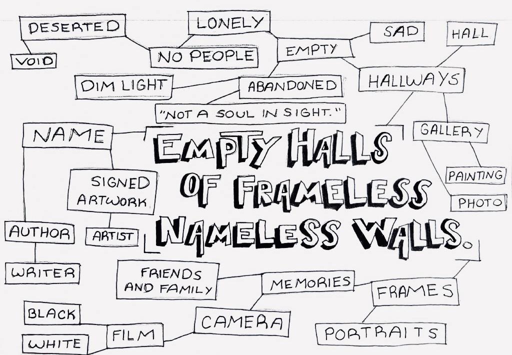 The concept is further developed by visually drawing word maps and matching to discover which words, phrases, or images match the six-word story. Several words and phrases were selected, such as deserted, abandoned, empty, lonely, and painting. These words were visually translated and incorporated into the final result.