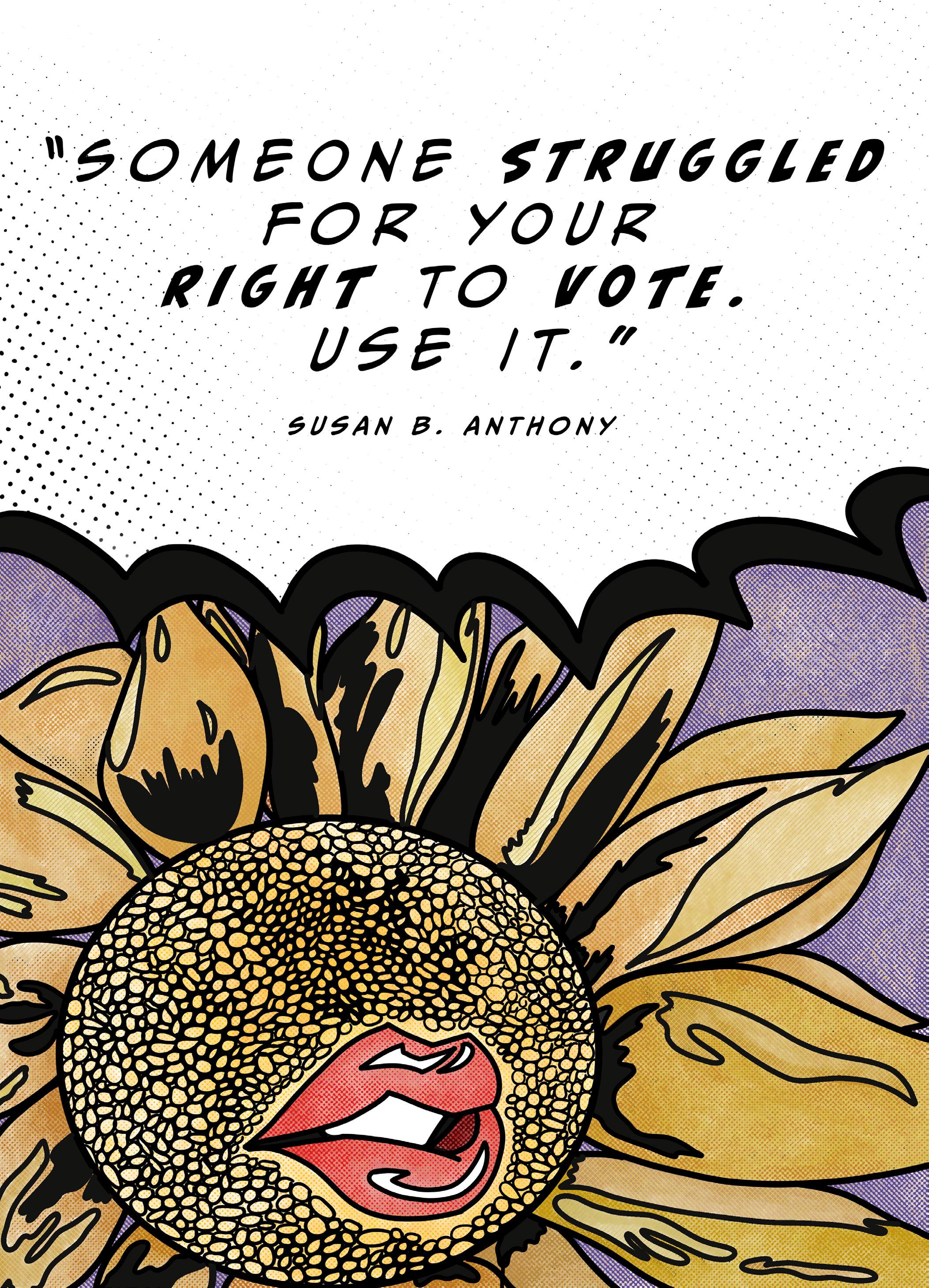 I started by creating a number of concept sketches to further explore the ideas that came out of Susan B. Anthony’s quote. Next, I created two main rough drafts to get an idea of what the final result would look like on paper. The first Rough Draft sketch received feedback in a class critique, in which I followed the advice of choosing a slightly different drawing than the original concept. Next, I further expanded on the rough draft by experimenting with the placement of the flower and implemented small changes in the typeface.