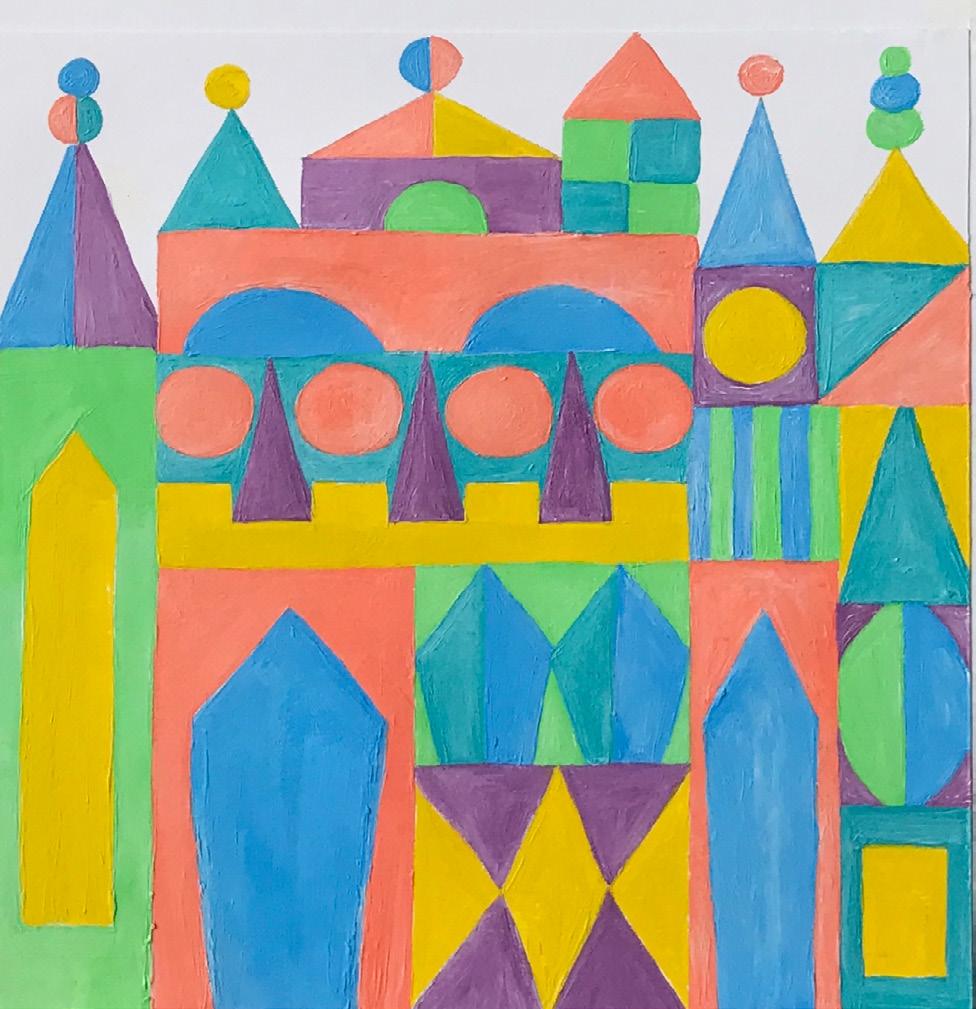 tints, hues, and shades on the color wheel. These two pieces of art are inspired by the works and creations of legendary Disney artist and designer Mary Blair. Blair had a distinct modernist art style that concentrated primarily on utilizing primary colors and shapes to create contrasting forms. My project allowed me to further explore her design style, while also providing a chance to experiment, apply, and expand my knowledge of color theory. The contrasting hues and values allowed me to focus more on the contrasting colors and how various color choices tend to complement or contrast each other. Contrasting temperatures (warm and cool) allowed me to focus more on how the temperature of color can allow the entire image to blend when converted to grayscale. What was perhaps the most surprising factor in completing these assignments is the ability for such simple shapes to be combined to form a rather interesting image. While creating precise lines and edges tended to be quite complicated for each project, I would enjoy applying what I have learned from these projects to my future graphic and illustrative work.