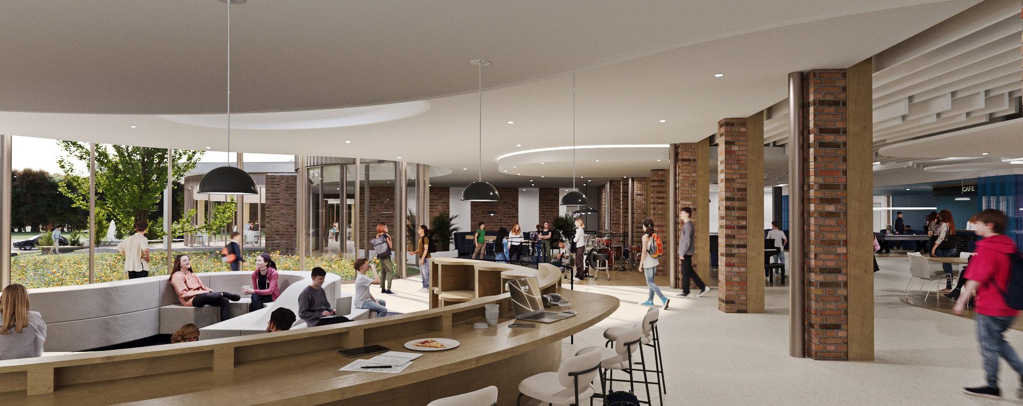 The current building efforts look to complete construction of the state-of-the-art Corsair Student Center, which combines a re-imagined cafeteria with a student lounge and courtyards, as well as a beautiful atrium addition to the auditorium foyer. The Sr. Frances Dolan, BVM Atrium will seamlessly flow into the Corsair Student Center, the two spaces creating one unified hub of social activity on campus.