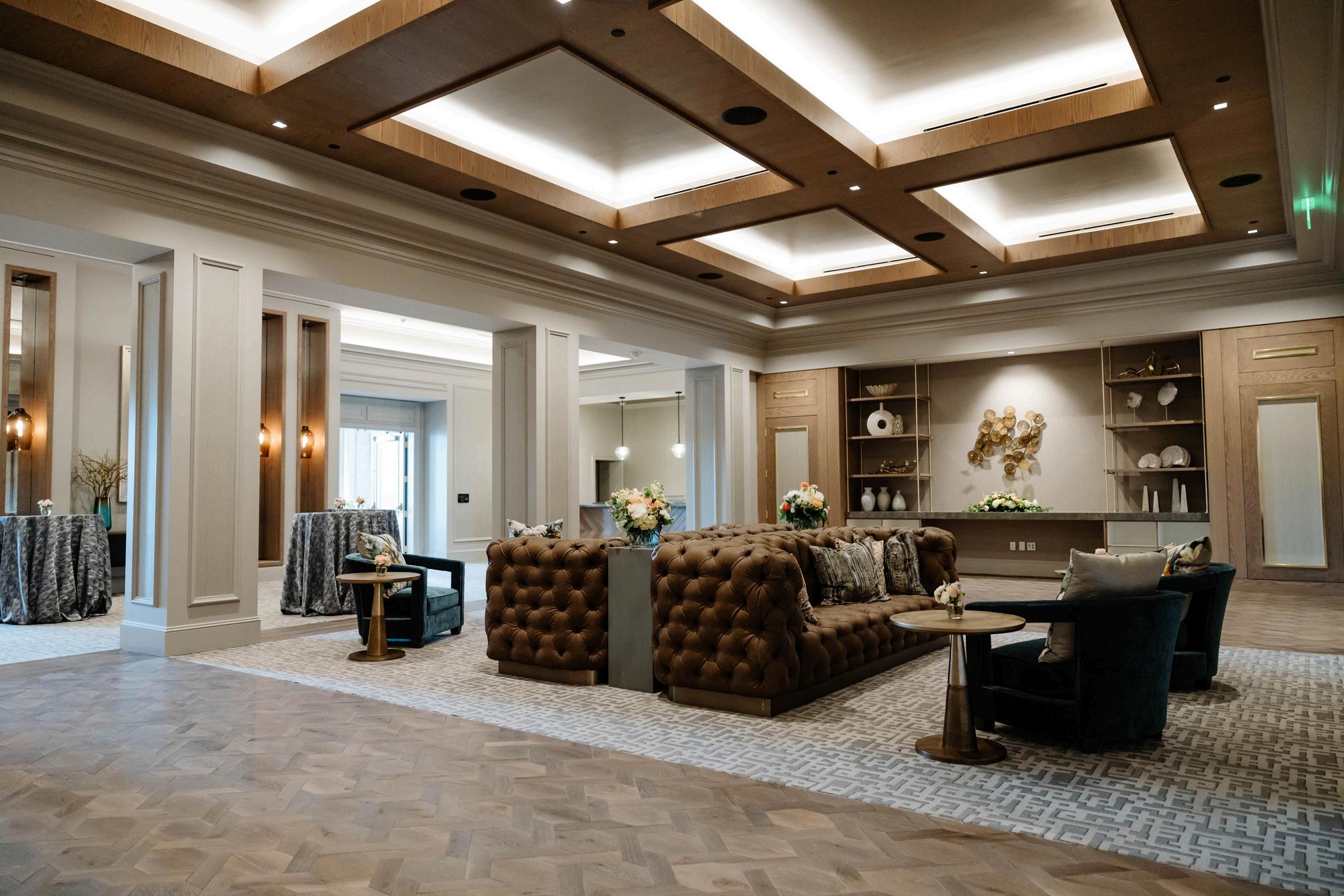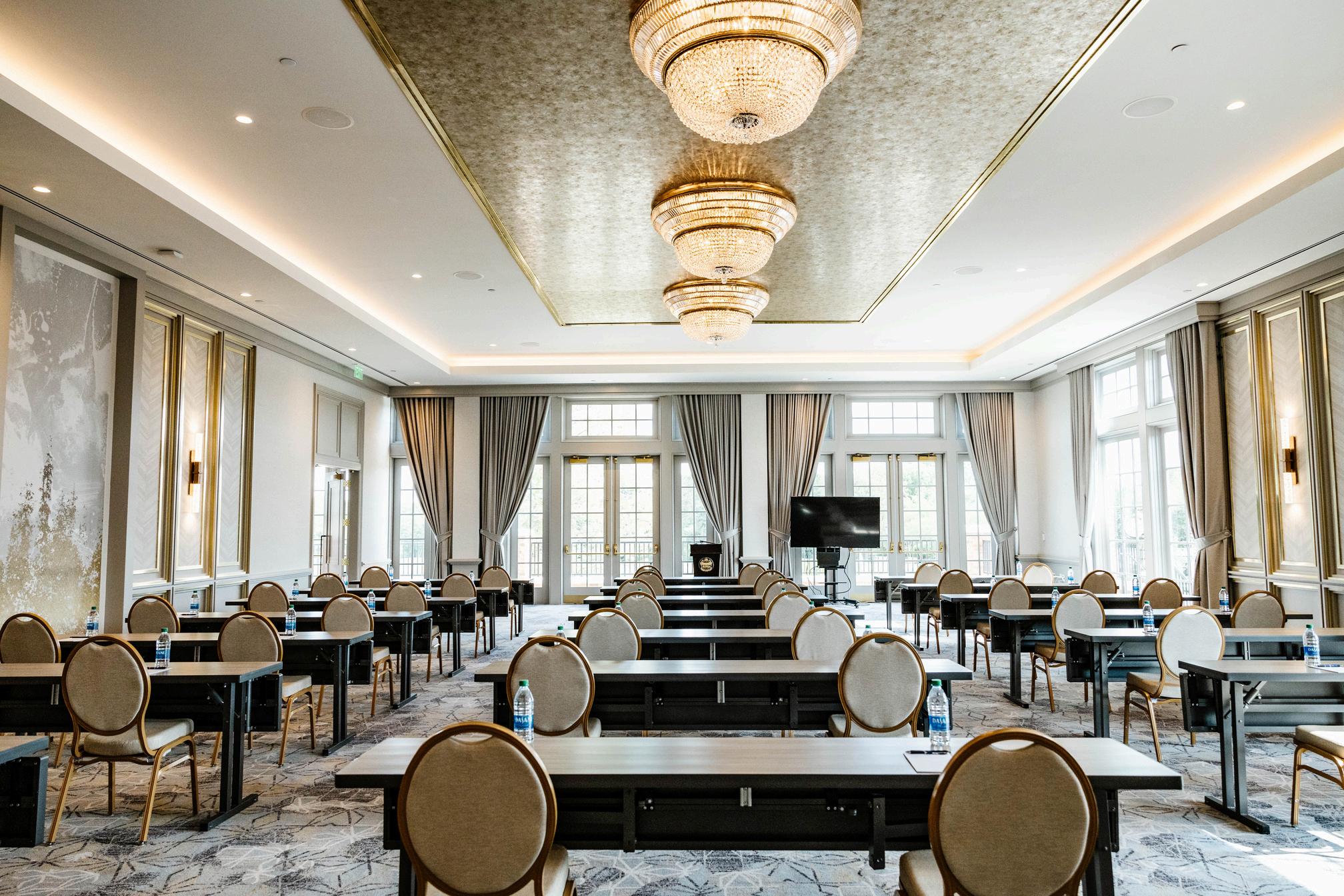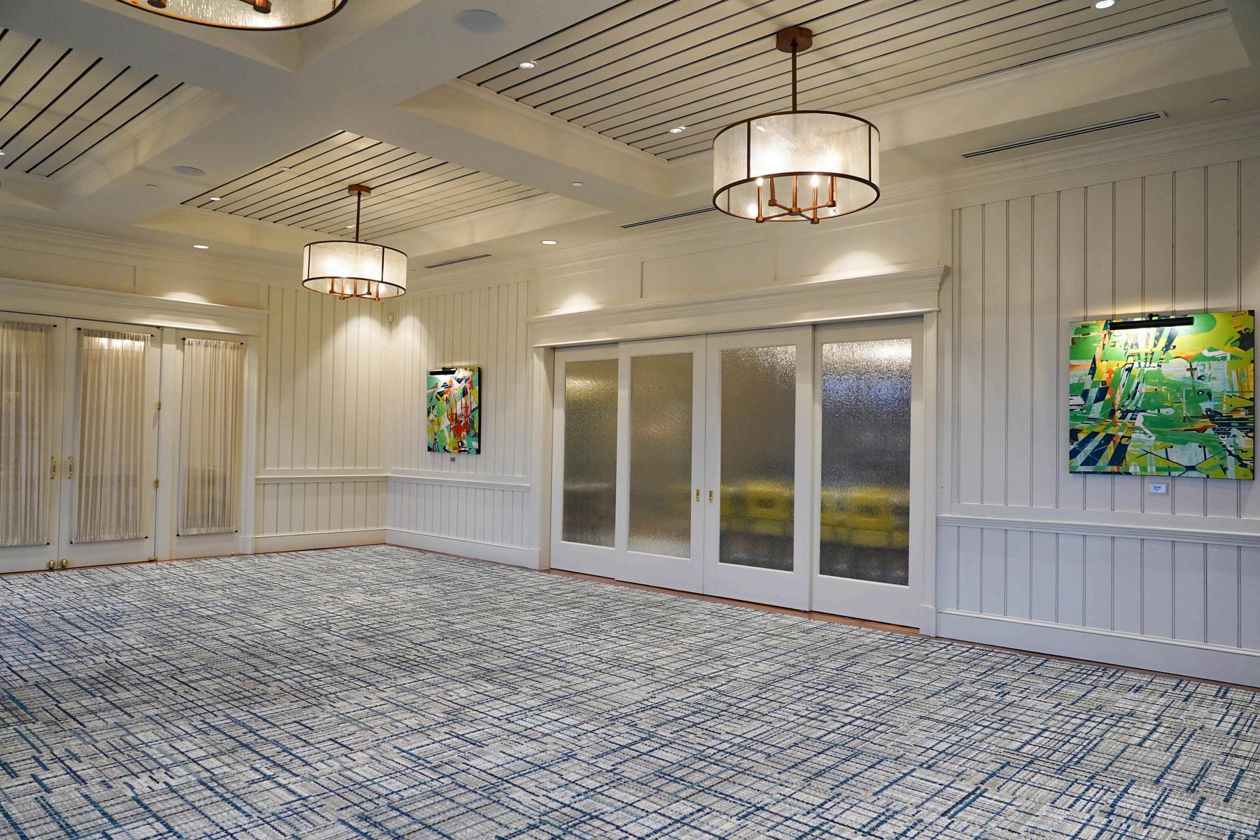 The elegant 4,500 sq foot ballroom features floor to ceiling windows to highlight the beautiful backdrop of the Carmel courses The classic design incorporates statement lights, neutral colors, and high-end finishes to complement a wide variety of events